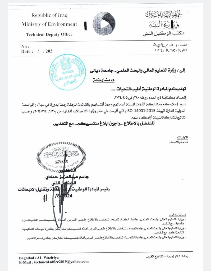 إنجاز أكاديمي مميز: م.د. إسراء عبد القاسم تتفوق في دورة تدريبية حول معايير الإدارة البيئية الدولية