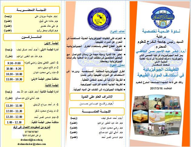 يقيم قسم الجيوفيزياء بكلية التحسس النائي والجيوفيزياء في جامعة الكرخ للعلوم الندوة التخصصية الاولى تحت عنوان " التطبيقات الجيوفيزيائية في استكشاف الموارد الطبيعية" تتضمن محاضرات متعددة من قبل خبراء في ميدان التحري الجيوفيزيائي.