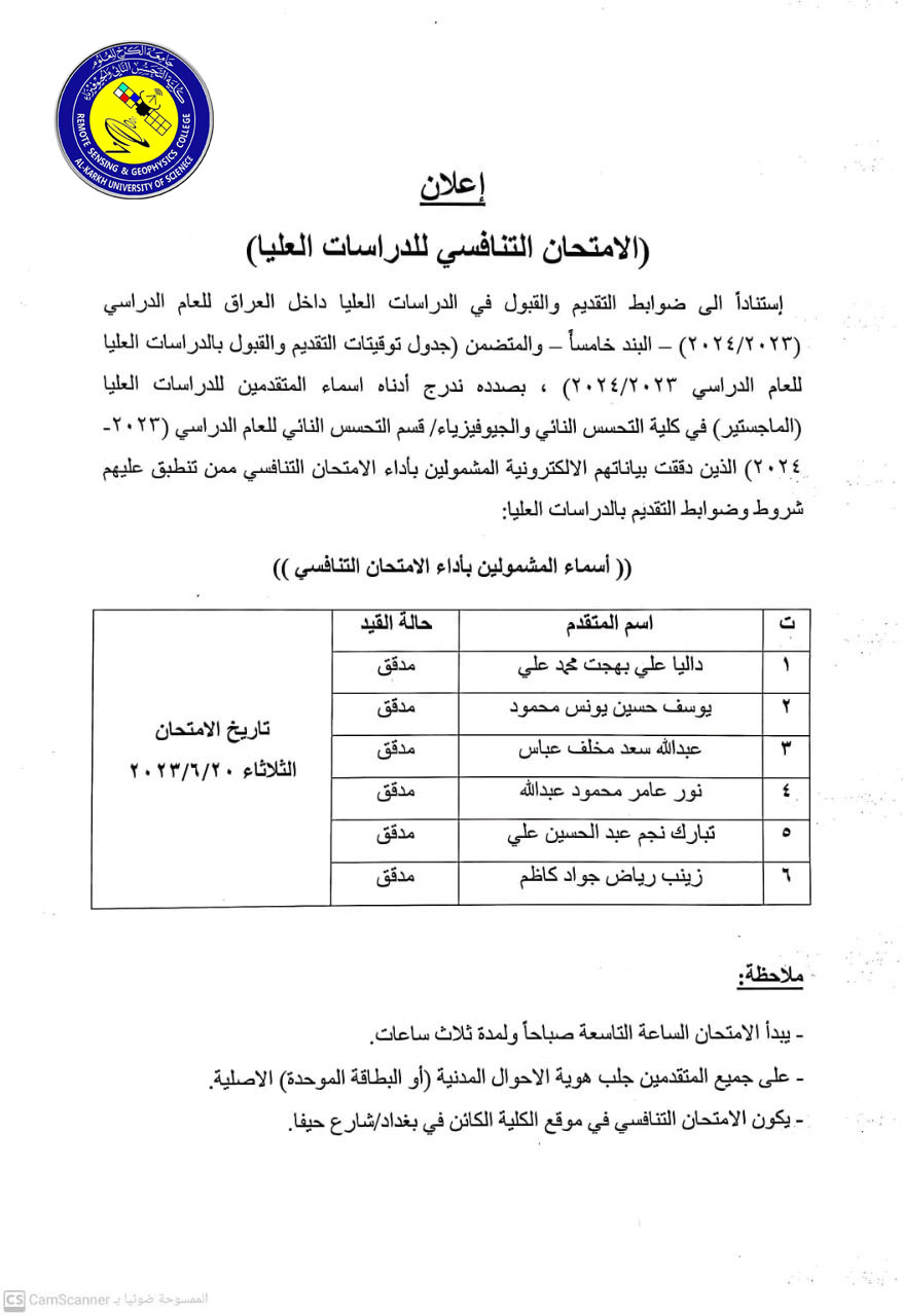 اعلان هام / الدراسات العليا Categories لوحة الاعلانات Date يونيو 11, 2023 Comments 2 comments Share: admin6342 Previous post اعلان هام جدا تمديد التقديم للدراسات العليا لغاية ٢٠٢٣/٦/٧ يوم الاربعاء يونيو 11, 2023 Next post اعلان نتائج الامتحان التنافسي للدراسات العليا 2023-2024 للعام الدراسي يونيو 21, 2023 You may also like إعلان هام | إطلاق جدول مراقبات امتحانات الدراسات العليا 18 ديسمبر, 2025 كلية التحسس النائي والجيوفيزياء تعلن نتائج القبول الأولي للمتقدمين إلى الدراسات العليا للعام الدراسي 2025–2026 10 يوليو, 2025 إعلان أسماء المشمولين بأداء الامتحان التنافسي للعام الدراسي 2025–2026 22 يونيو, 2025