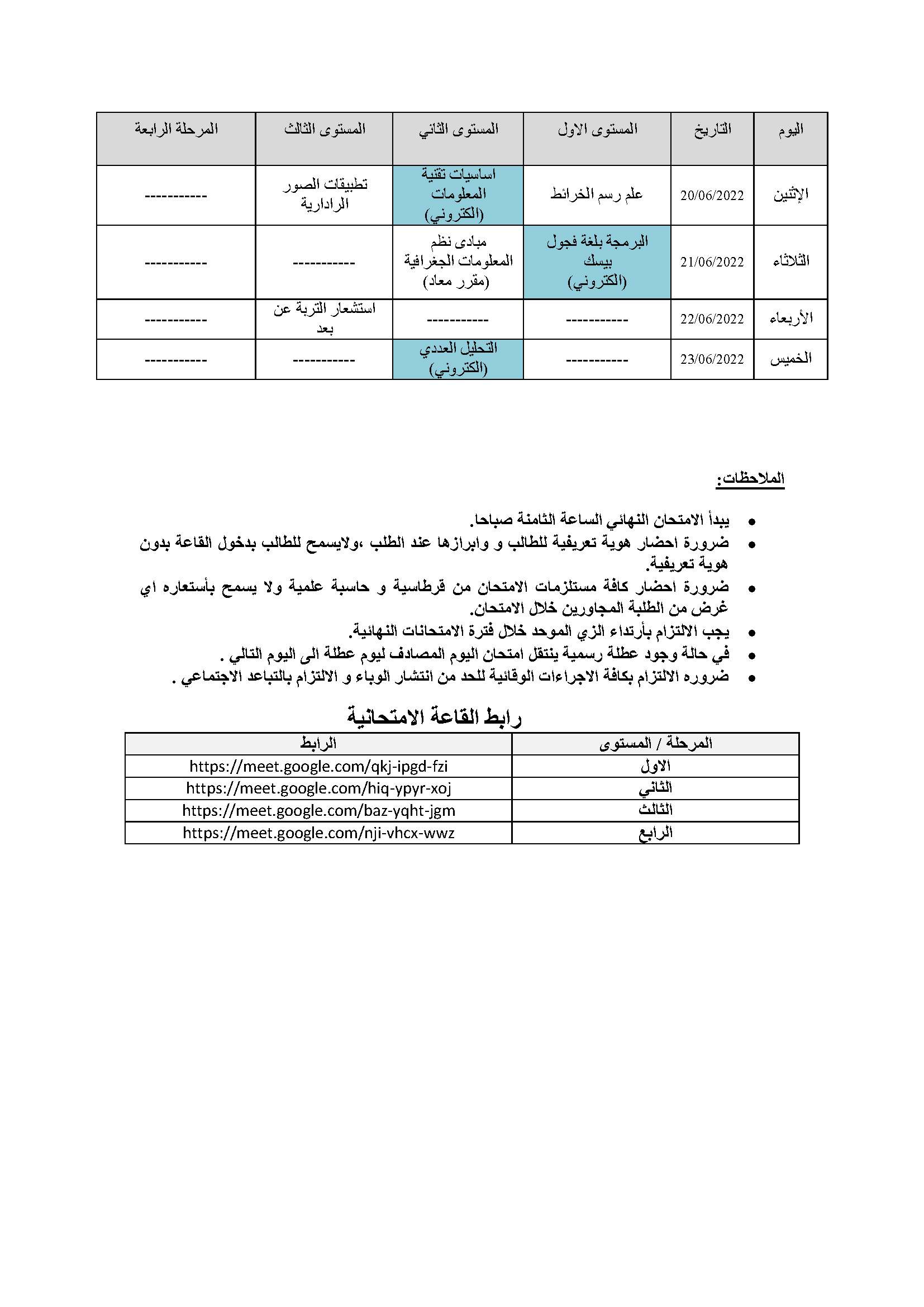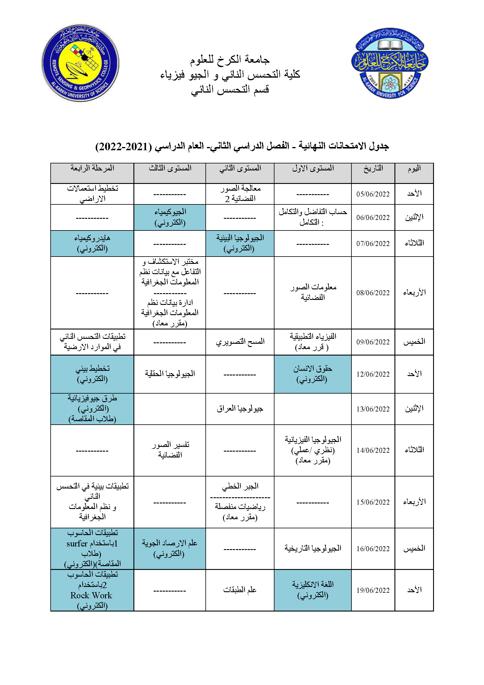 اعلان هام جداول امتحان قسم التحسس النائي Categories لوحة الاعلانات Date مايو 26, 2022 جداول الامتحانات النهائية للفصل الدراسي الثاني / للعام الدراسي 2022/2021 لطلبة قسم التحسس النائي في كليتنا للمستويات كافة – الاول – الثاني – الثالث – الرابع للدراسة الصباحية والمسائية . Share: admin6342 Previous post زيارة تفقدية لطلبة الاقسام الداخلية التابعة لكليات جامعة الكرخ للعلوم مايو 26, 2022 Next post اعلان هام جداول امتحان قسم الجيوفيزياء مايو 26, 2022 You may also like إعلان هام | إطلاق جدول مراقبات امتحانات الدراسات العليا 18 ديسمبر, 2025 كلية التحسس النائي والجيوفيزياء تعلن نتائج القبول الأولي للمتقدمين إلى الدراسات العليا للعام الدراسي 2025–2026 10 يوليو, 2025 إعلان أسماء المشمولين بأداء الامتحان التنافسي للعام الدراسي 2025–2026 22 يونيو, 2025