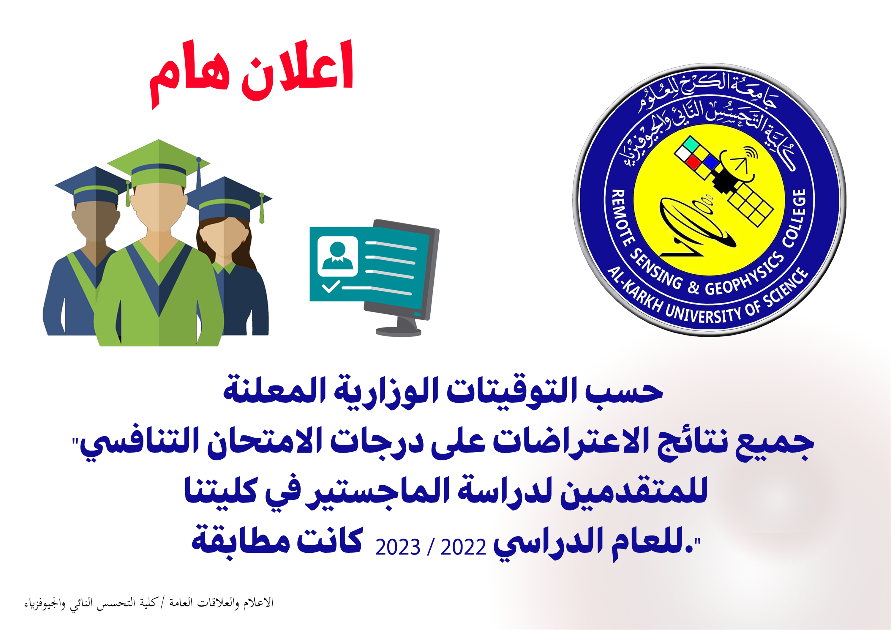 اعلان Categories لوحة الاعلانات Date يونيو 1, 2022 Comments 2 comments Share: admin6342 Previous post هام جدا نتائج القبول الاولي للمتقدمين للدراسات العليا يونيو 1, 2022 Next post اعلان نتائج القبول النهائي للمتقدمين للدراسات العليا للعام الدراسي 2022-2023 يونيو 3, 2022 You may also like إعلان هام | إطلاق جدول مراقبات امتحانات الدراسات العليا 18 ديسمبر, 2025 كلية التحسس النائي والجيوفيزياء تعلن نتائج القبول الأولي للمتقدمين إلى الدراسات العليا للعام الدراسي 2025–2026 10 يوليو, 2025 إعلان أسماء المشمولين بأداء الامتحان التنافسي للعام الدراسي 2025–2026 22 يونيو, 2025