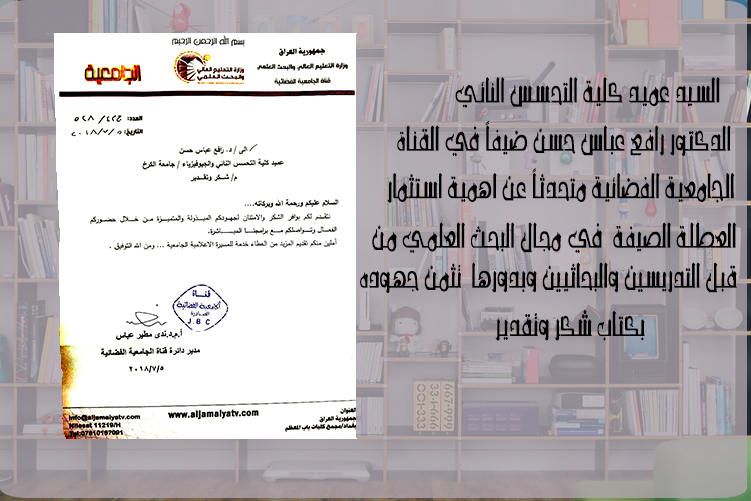 الجامعية الفضائية تستضيف السيد عميد كلية التحسس النائي والجيوفيزياء Categories اخبار الكلية Date يوليو 7, 2018 Comments 1 comment الجامعية الفضائية تستضيف السيد عميد كلية التحسس النائي والجيوفيزياء الدكتور رافع عباس حسن متحدثاً عن اهمية استثمار العطلة في مجال البحث العلمي من قبل التدريسين والباحثين Share: admin6342 Previous post معالي وزير التعليم العالي والبحث العلمي يثمن جهود السيد عميد كلية التحسس النائي والجيوفيزياء يوليو 7, 2018 Next post ورشة عمل في كلية التحسس النائي والجيوفيزياء بعنوان مشاريع البنى التحتية وعقود الـ BOT يوليو 11, 2018 You may also like عميد كلية التحسس النائي والجيوفيزياء يتفقد سير امتحانات نهاية الكورس الأول 4 يناير, 2026 كلية التحسس النائي والجيوفيزياء تنظم ورشة عمل بعنوان “هجرة الشباب هدر لقدرات المجتمع” 22 ديسمبر, 2025 جامعة الكرخ للعلوم تنظم المؤتمر التقويمي للاعتماد البرامجي لتعزيز جودة التعليم الأكاديمي 22 ديسمبر, 2025