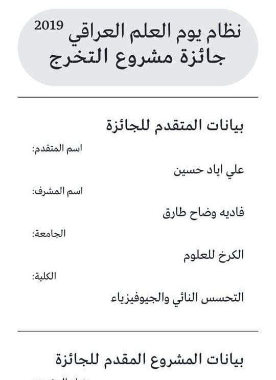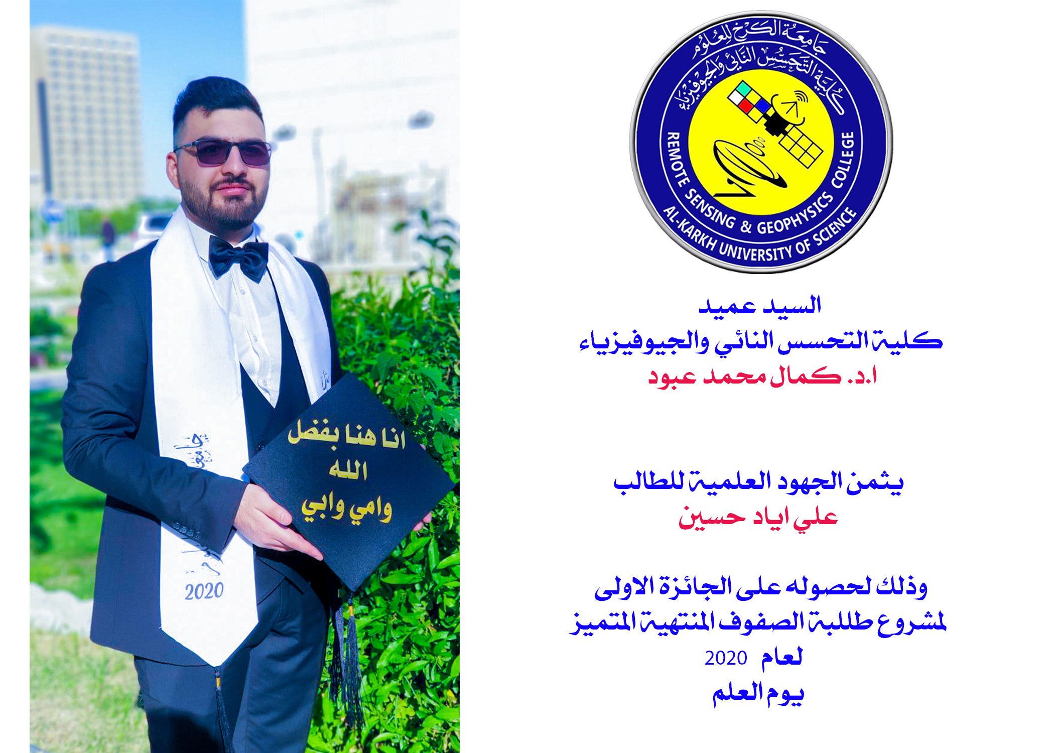 ثمن السيد عميد كلية التحسس النائي والجيوفيزياء الطالب في قسم التحسس النائي ( علي اياد حسين ) المتخرج ضمن الدفعة الاولى لكليتنا وذلك لحصده الجائزة الاولى لأفضل مشروع طلبة الصفوف المنتهية المتميز في يوم العلم العراقي