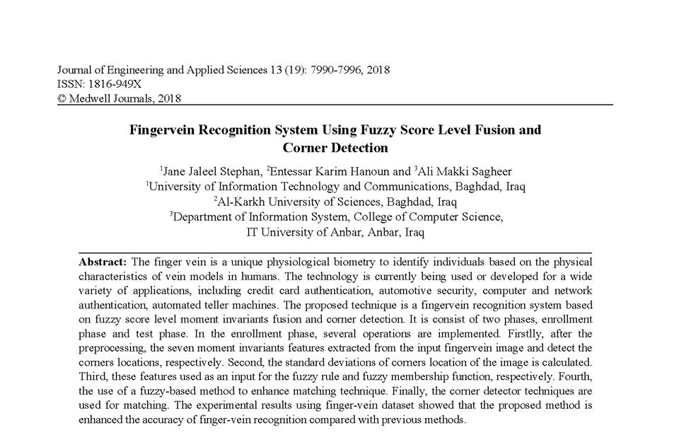 تضمن البحث المشترك، الذي إنجز بالتعاون مع الدكتور علي مكي والدكتور جين جليل اسطيفان، تطوير طريقة جديدة للتعرف على الافراد بالاعتماد على خصائص بدنية لنماذج الوريد لدى البشر، بأستخدام اندماج مستوى النطاق المضبب وكشف الزوايا.