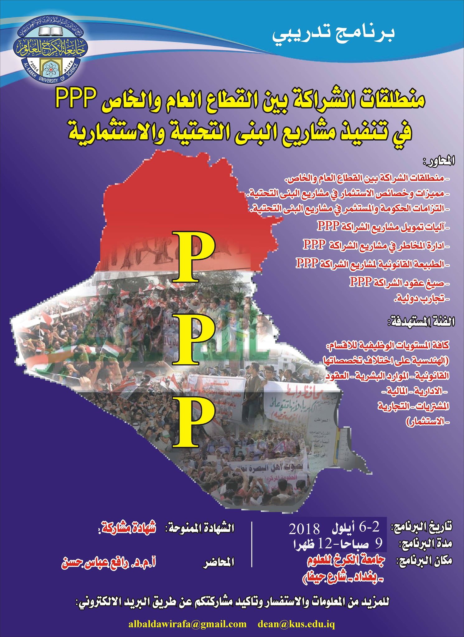 حرص جامعتنا الغراء (جامعة الكرخ للعلوم) بتفعيل واحدة من المهام الرئيسية للمؤسسات الأكاديمية إلا وهو مهمة خدمة المجتمع .. ندعو جميع العاملين في الأقسام الهندسية والقانونية والتجارية والعقود والأستثمار في مختلف وزارات ومؤسسات الدولة والقطاع الخاص لحضور البرنامجوالذي تنظمه جامعتنا حول مشاريع البنى التحتية وعقود البوت , لما يكتسبه هذا النوعمن المشاريع من تطبيقات متصاعدة دوليا، وان العراق عبر كافة وزاراته ومؤسساته بحاجة الى اتباع هذا النوع من المشاريع.البرنامج مفتوح لكافة الدرجات الوظيفية وخصوصا اصحاب القرار للأطلاع على مفاهيم واسس تطبيق هكذا نوع من العقود على مشاريع البنى التحتية.