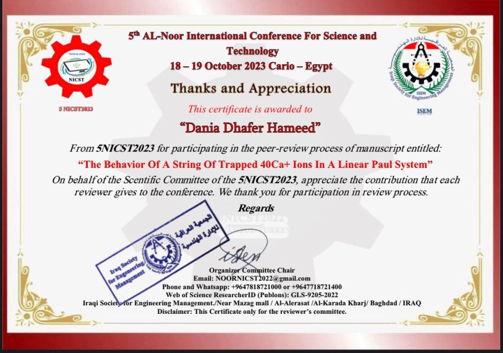 في المؤتمر العلمي الدولي الخامس المنعقد في القاهرة، تم تكليف (م.م. دانيا ظافر حميد) التدريسية في كلية التحسس النائي والجيوفيزياء بتقييم البحث العلمي الموسوم “The Behavior of A String of Trapped 40Ca+ Ions In A Linear Pual System” اذ يهدف البحث الى بناء نموذج كمي للتجارب العلمية في مجال الحوسبة الكمية من خلال استعمال الايونات 40 Ca+ لمعالجة الحالات الكمومية عند ترددات مختلفة لأشعة الليزر، ودراسة التأثير الترددي المحوري اثناء حصر الايونات والتحكم فيها في تسلسل خطي لضمان حركتها كوحدة واحدة وبالتالي انتاج كيوبت كمي يسهل التحكم فيه. ويمثل هذا العمل احد المبادئ الاساسية وراء الحواسيب الكمية.