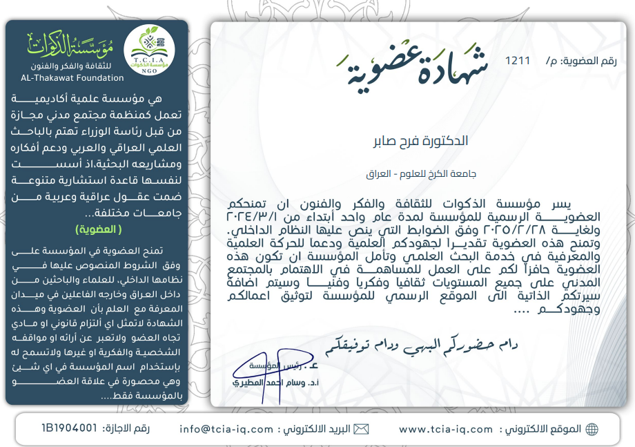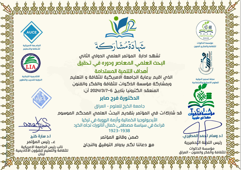 شاركت ا.م.د.فرح صابر محمد التدريسية في كليتنا في المؤتمر العلمي الدولي الثاني تحت عنوان(البحث العلمي ودوره المعاصر في تحقيق التنمية المستدامة) الذي عقدته الجامعة اللبنانية في بيروت بتاريخ 6-7/ 2024 :عن بحثها الموسوم