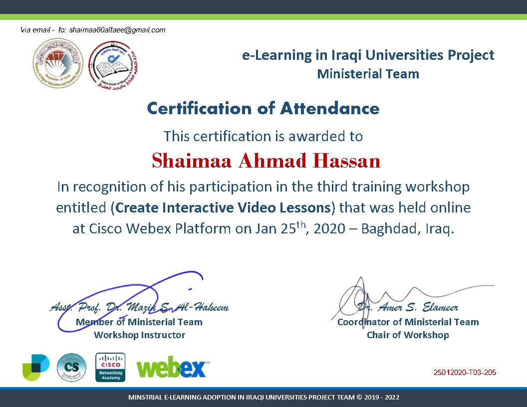 شاركت التدريسية كلية التحسس النائي والجيوفيزيائي م.د. شيماء احمد حسن في الورشة التدريبية الثالثة الي اقامها الفريق الوزاري لمشروع التعليم الالكتروني في الجامعات العراقية والتي كانت بعنوان