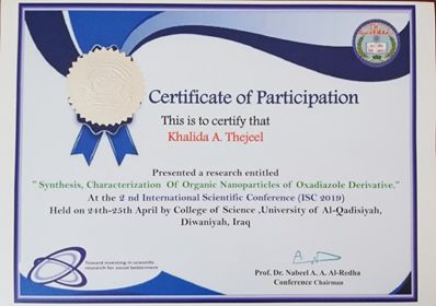 شاركت التدريسية د. خالدة علي ببحث والذي كان بعنوان synthesis ,characterization of organic nanoparticles of oxadaizole derivatives في المؤتمر الدولي العلمي الثاني والذي اقيم في جامعة القادسية / كلية العلوم للفترة من ٢٤-٢٥ /٤/ ٢٠١٩ وشارك في المؤتمر اكثر من ٤٠٠ بحث في مختلف المجالات الكيمياء والفيزياء والرياضيات وعلوم الحياة والجيولوجيا والحاسبات والزراعة وحضر المؤتمر الباحثين من مختلف جامعات العراق واكثر من ٢٠ دولة عربية وعالمية ومن اهداف المؤتمر هو عرض اهم ما توصلت اليه العلوم في المجالات المختلفة