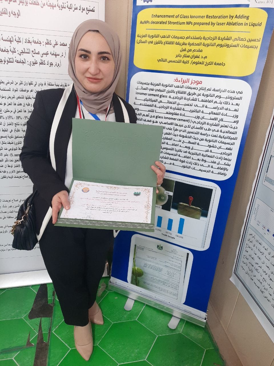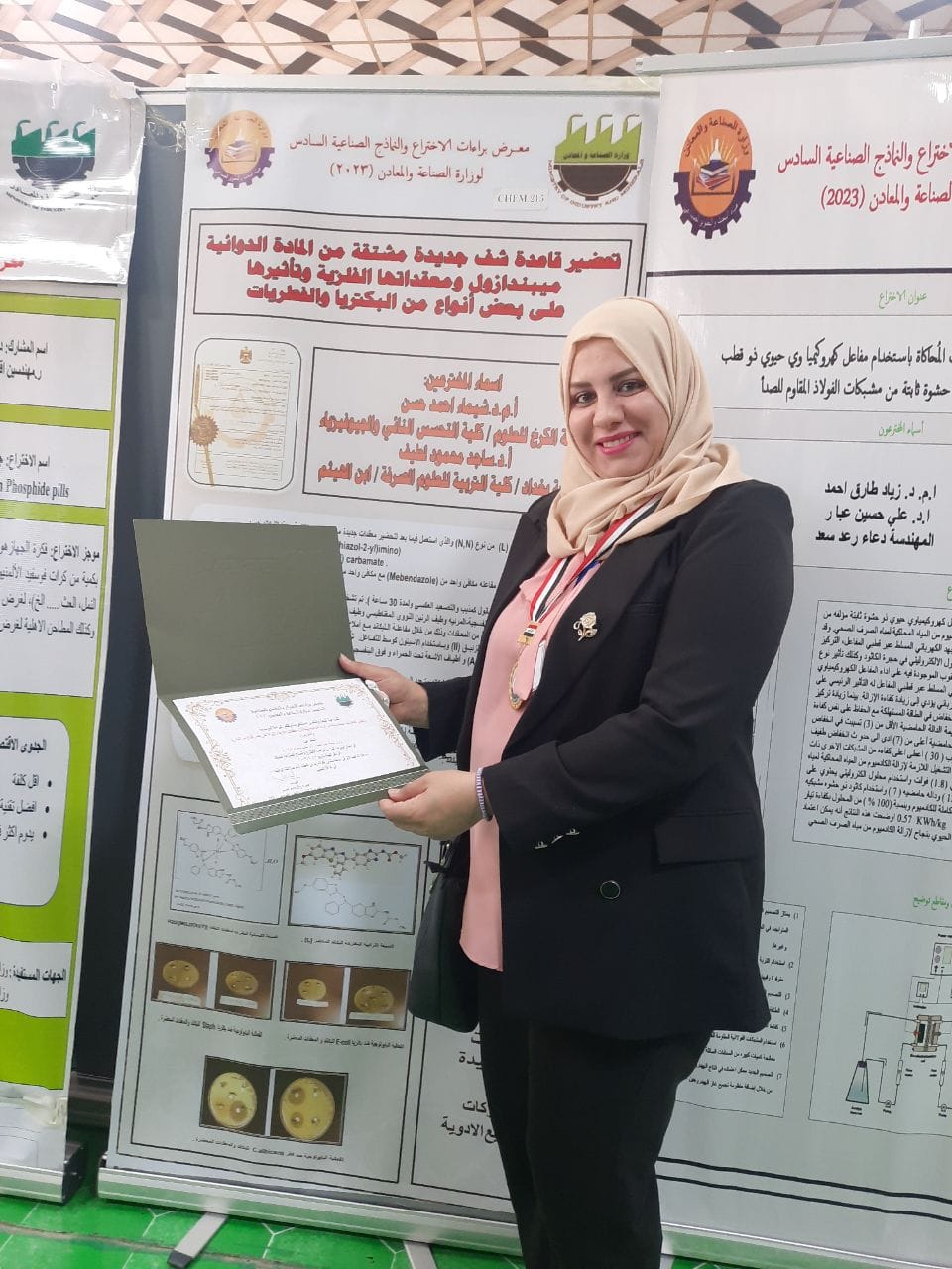 شـــاركت كـــل مــن الاستــاذ المســاعد الدكتــور (شيماء احـمد حســن) والمــدرس الدكتــور (غفـــران ستــار جبــار) التدريسيتــان فـــي كلية التحســس النائـــي والجيوفيزيــاء فـــي مؤتمــر ومعرض براءات الاختــراع الســـادس الــذي تقيمــه وزارة الصنـــاعة والمعادن فــي مقـــرها / هيئة البحـــث والتطويـــر عــــن براءات اختـــراع لهمـــا بتاريخ 12/9/2023 وقد حصلتا على وساماً علمياً وشهادات شكر وتثمين جهود.