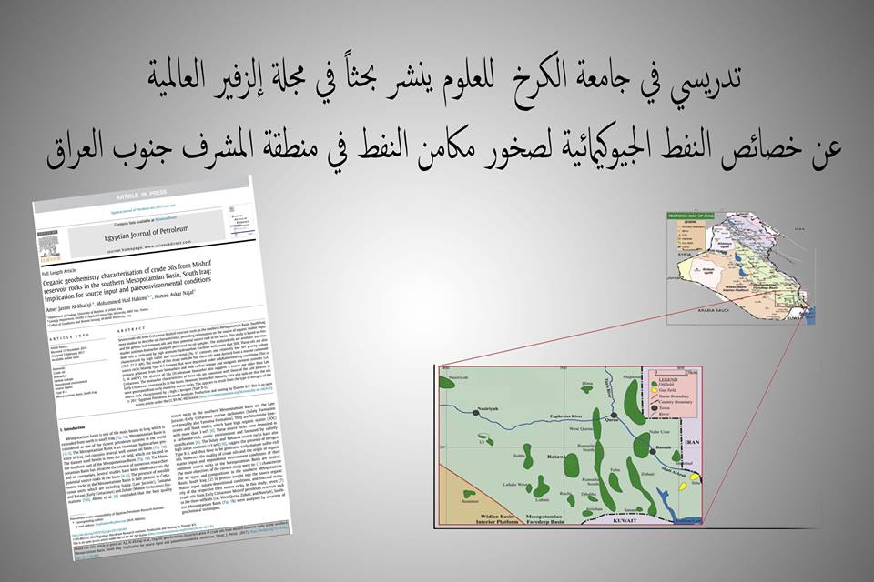 نشر التدريسي في كلية التحسس النائي والجيوفيزياء الدكتور أحمد عسكر نجف، بحثاً علمياً عن خصائص النفط الجيوكيمائية لصخور مكامن النفط في منطقة المشرف جنوب العراق، بمجلة (Elsevier إلزفير ) العلمية الي تصدر في هولندا.