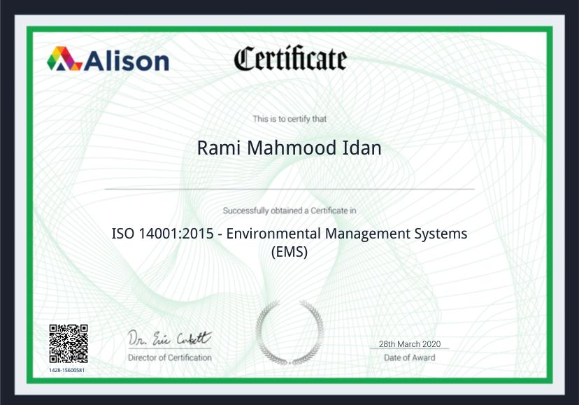 حصل التدريسي في قسم الجيوفيزياء ا.م.د. رامي محمود عيدان على شهادة ايزو (EMS Environmental Management System) من مركز اليسون الدولي