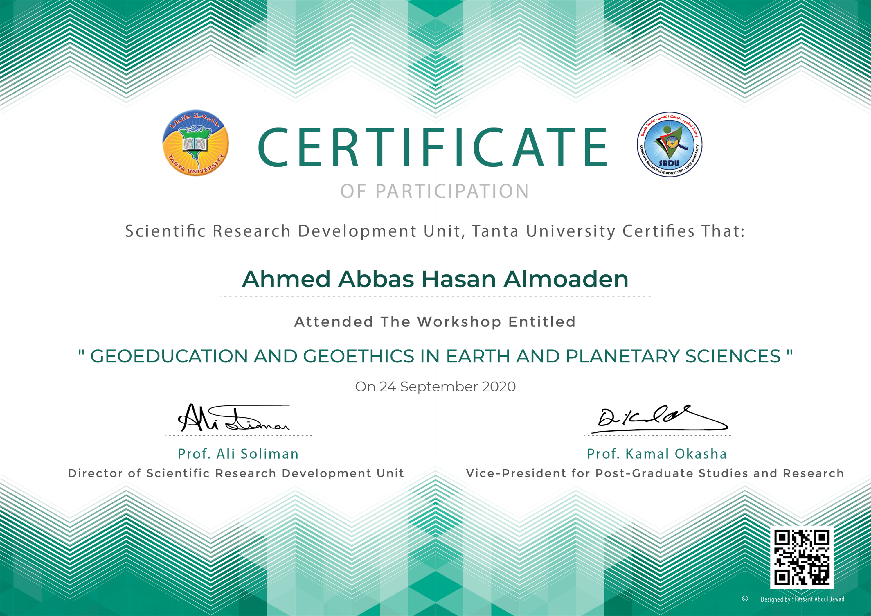 شارك التدريسي في كلية التحسس النائي والجيوفيزياء الاستاذ المساعد الدكتور احمد عباس حسن المؤذن – رئيس قسم التحسس النائي بورشه عمل عبر الانترنت نظمتها وحدة تطوير البحث العلمي بجامعة طنطا – في مصر بعنوان
