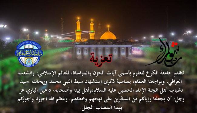 تتقدم جامعة الكرخ للعلوم بأسمى آيات الحزن والمواساة، للعالم الإسلامي، والشعب العراقي، ومراجعنا العظام، بمناسبة ذكرى استشهاد سبط النبي محمد وريحانته ،سيد ىشباب أهل الجنة الإمام الحسين عليه السلام،وأهل بيته وأصحابه، داعين الباري عز وجل، أن يجعلنا وإياكم من السائرين على نهجهم وخطاهم، وعظم الله اجورنا واجوركم بهذا المصاب الجلل.