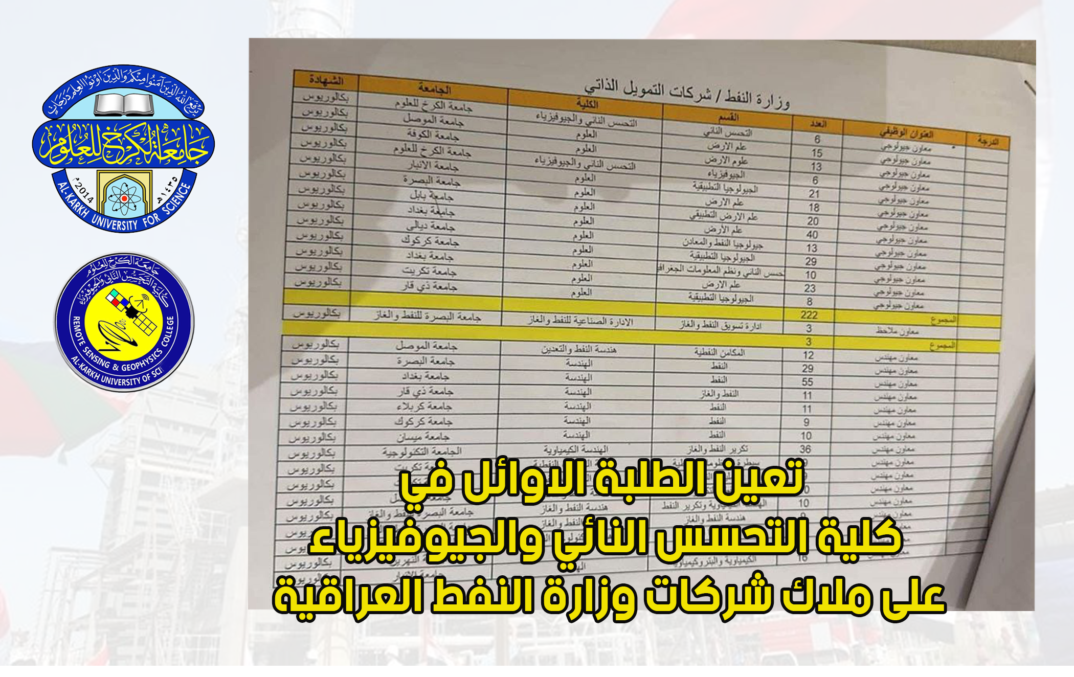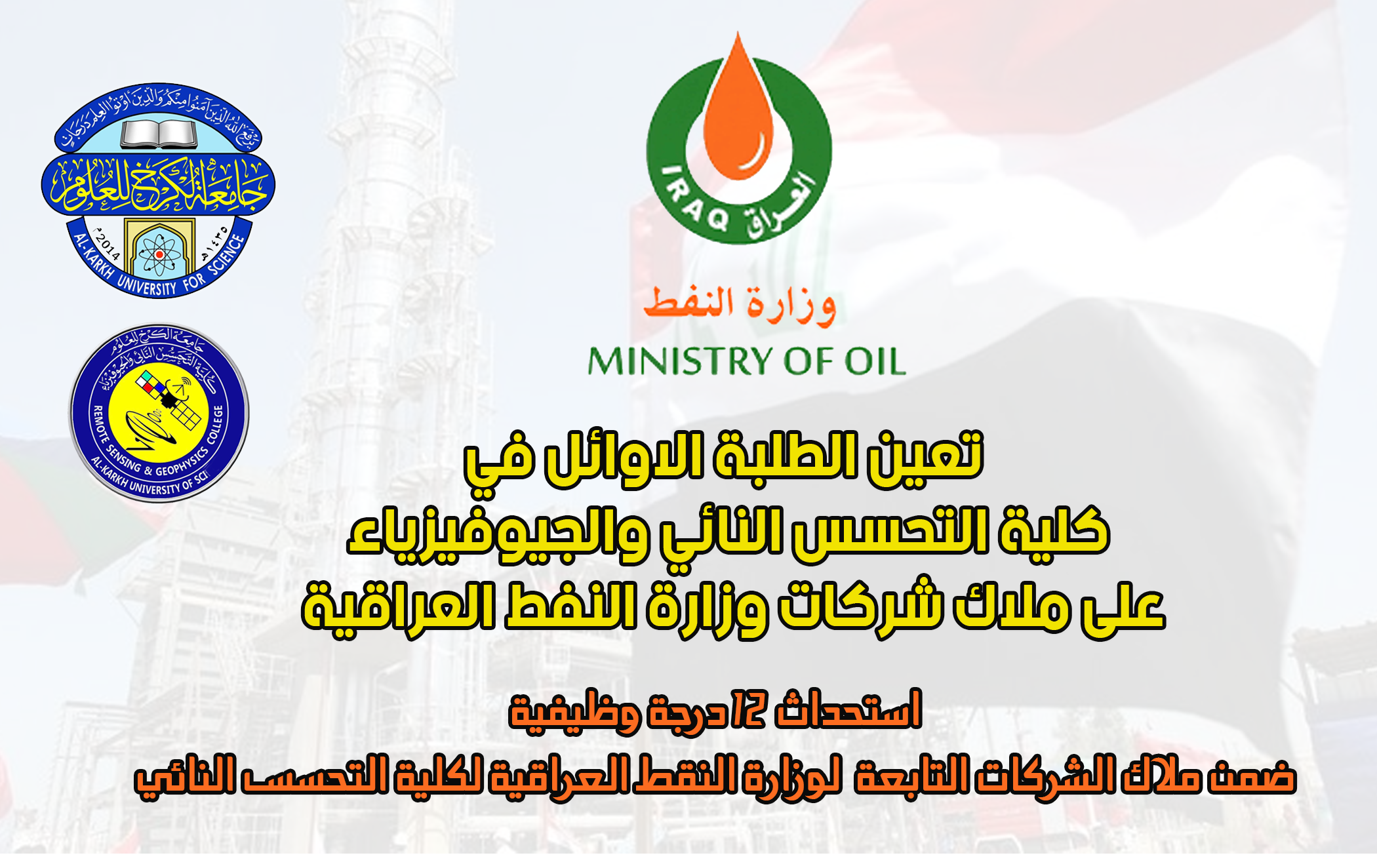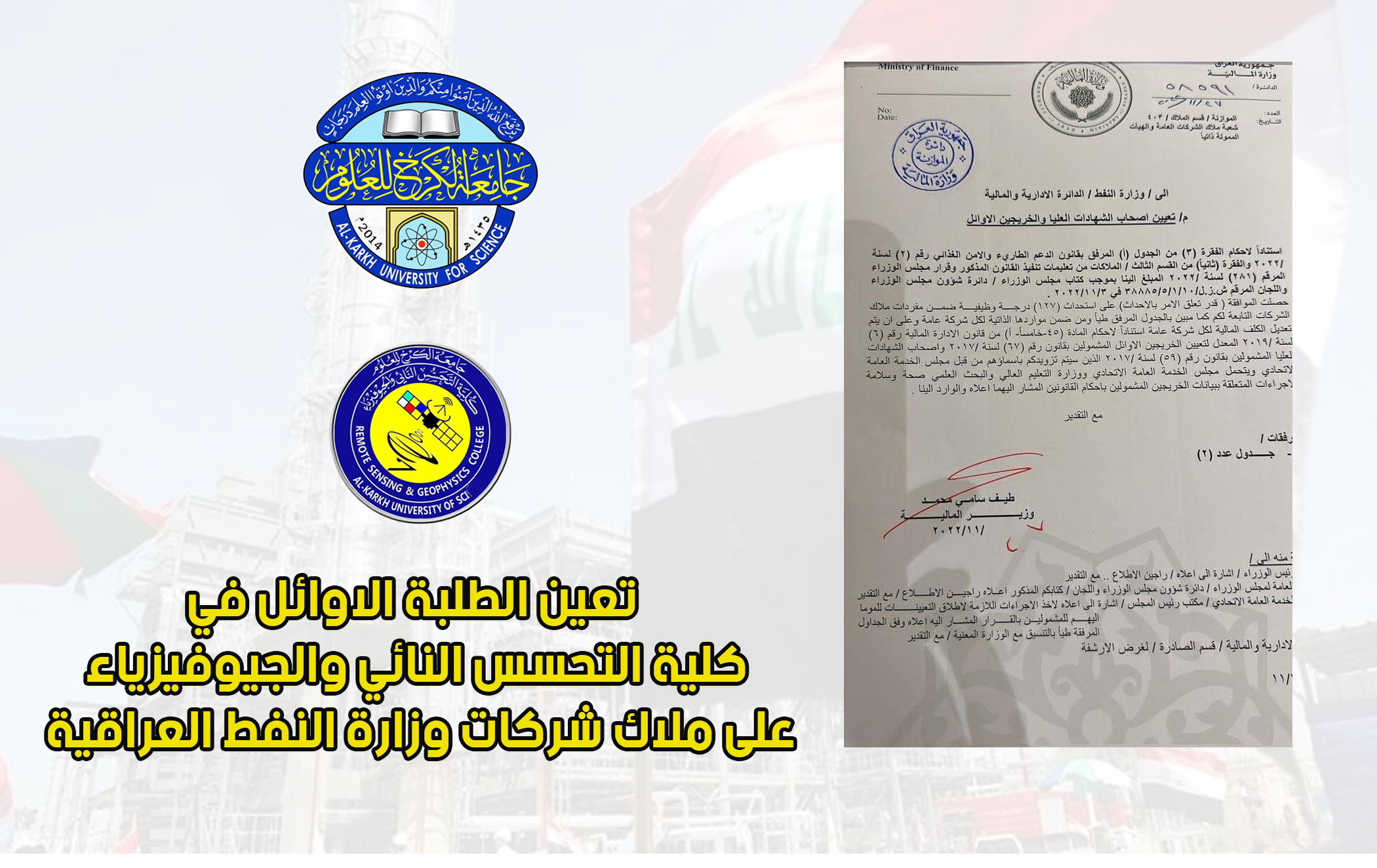 تعين الطلبة الاوائل في كلية التحسس النائي والجيوفيزياء على ملاك شركات وزارة النفط العراقية