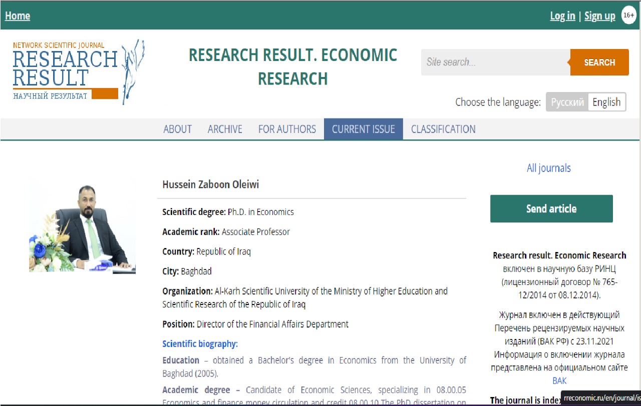 حصــل التدريســي فـي كليـة التحسـس النائـي والجيوفيزيـاء (م.د. حسيــن زبون عليــوي) علـى عضويـة هيئة تحرير فـي المجلة العالمية Research Result. Economic Research وهي مجلة تعنى بنشر العلوم الاقتصادية تصدر من جامعة بيلغورود الحكومية في دولة روسيا الاتحادية وتنشر ثلاثة إلى اربعة اعداد سنوياً تتضمن جميع تخصصات العلوم الاقتصادية.
