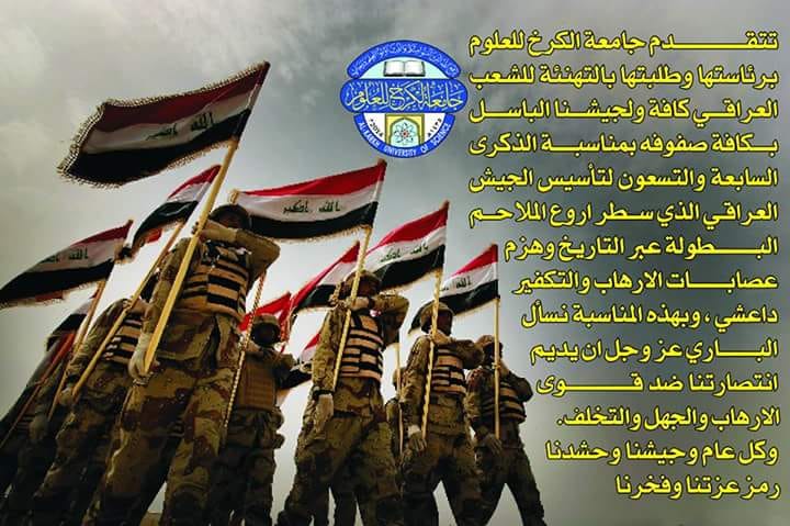 تتقدم جامعة الكرخ للعلوم برئاستها ومنتسببها وطلبتها بالتهنئة للشعب العراقي كافة ولجيشنا الباسل بكافه صنوفه، بمناسبة الذكرى السابعة والتسعون لتأسيس الجيش العراقي الذي سطر أروع الملاحم البطولية عبر التاريخ وهزم عصابات الإرهاب والتكفير والتخلف داعش، فكل عام وجيشنا وحشدنا رمز عزتنا وفخرنا