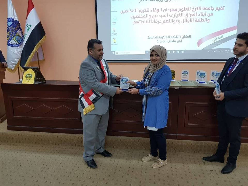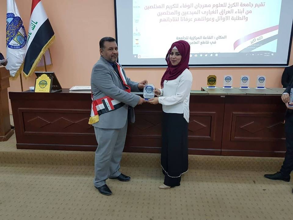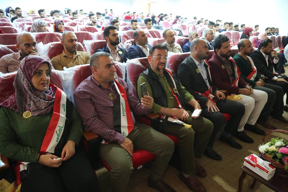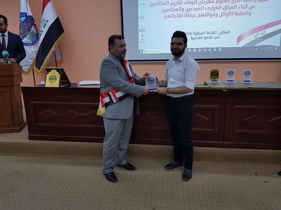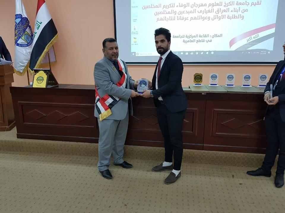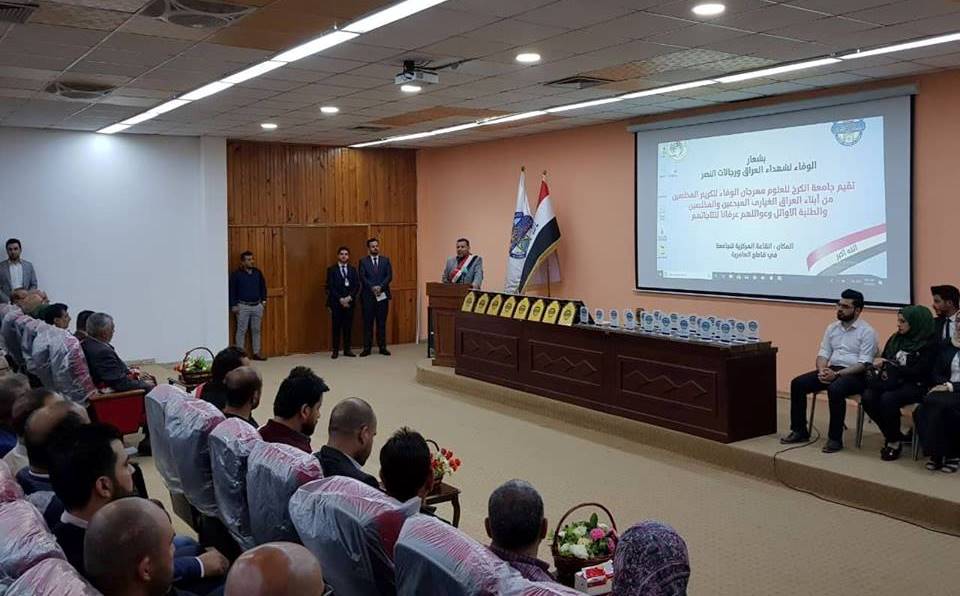 نظمت جامعة الكرخ للعلوم مهرجانا واسعا للاحتفاء بعدد من المتميزين في الاعلام الحربي ومن الشعراء والادباء والفنانين وطلبة الجامعة الاوائل ، برعاية السيد رئيس الجامعة الدكتور ثامر عبد الامير حسن، وبحضور السادة مساعدي رئيس الجامعة للشؤون الادارية والعلمية وعمداء الكليات وطلبة ومنتسبي الجامعة.تضمن المهرجان الذي أقيم تحت شعار " الوفاء لشهداء العراق ورجالات النصر" الاحتفاء بعدد من رجالات النصر ومنهم المراسل الحربي علي جواد والسيد مرتضى الموسوي وحسين الفارس، والفنان ابراهيم النقاش، والدكتورة أماني التميمي، والشاعر الكبير جواد الحمراني والشاعر إبراهيم الحفيف.يهدف المهرجان الذي عقد بذكرى استشهاد المفكر العالمي السيد محمد باقر الصدر، إلى استذكار المتميزين ممن ساهموا في تحقيق النصر على عصابات داعش سواء بنقل الانتصارات بالصورة الحية والفن والقصائد الحماسية ودعم النازحين والايتام، فضلا عن تكريم الطلبة الاوائل والمتميزين وعوائلهم ليكونوا قدوة لزملائهم وأقرانهم.وقال الدكتور ثامر في كلمة له خلال المهرجان، في ذكرى استشهاد السيد محمد باقر الصدر علينا أن نكون أرثا حقيقا لهذا العالم الجليل الذي أبهر العالم أجمع بما قدمه من علم رغم الحصار عليه وعلى تلك المؤسسة التي انطلقت منها الفتوى المباركة لتحرير أرض العراق من دنس الارهاب.وأضاف، إن احتفالنا اليوم بهؤلاء المبدعين من أبطال النصر هو رسالة إلى العالم أجمع بأن العراق ولد عملاقا، وسيظل بإرادة أبنائه النجباء والابطال.