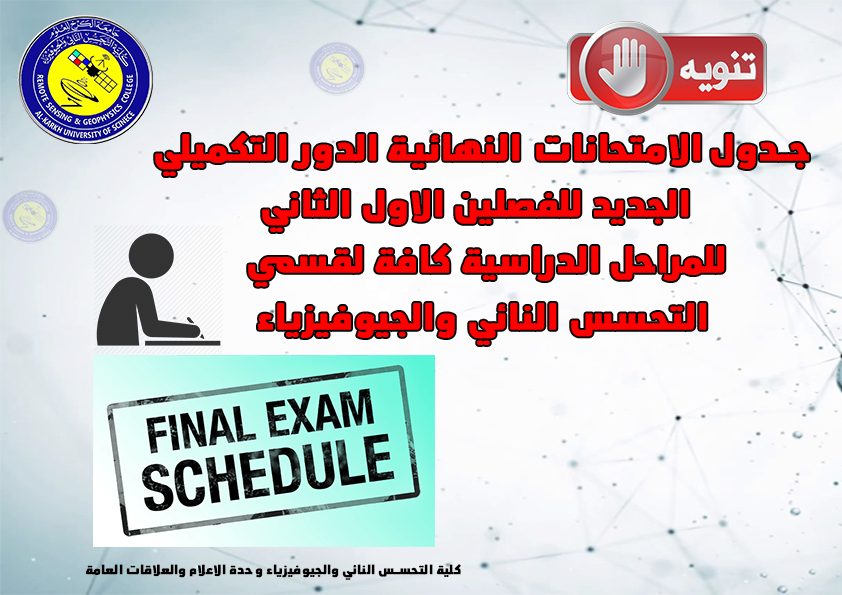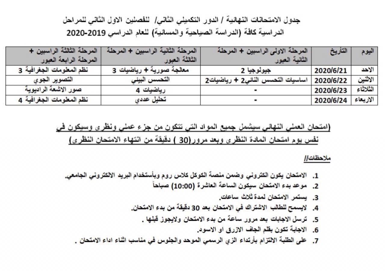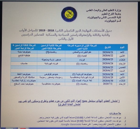 جدول الامتحانات التكميلي بعد التعديل Categories اخبار الكلية Date يونيو 18, 2020 طلبتنا الاعزاء .. تنويه هام جدول الامتحان التكميلي بعد التعديل بسبب اعتبار يوم الخميس حظر للتجول بحسبب تعليمات خلية الازمة تمنياتنا لكم بالموفقية والنجاح Share: admin6342 Previous post كلية التحسس النائي والجيوفيزياء تعلن نجاح الامتحان الالكتروني التجريبي يونيو 18, 2020 Next post مراعاة السلامة البدنية في المكتب جزء من السلامة المهنية يونيو 19, 2020 You may also like عميد كلية التحسس النائي والجيوفيزياء يتفقد سير امتحانات نهاية الكورس الأول 4 يناير, 2026 كلية التحسس النائي والجيوفيزياء تنظم ورشة عمل بعنوان “هجرة الشباب هدر لقدرات المجتمع” 22 ديسمبر, 2025 جامعة الكرخ للعلوم تنظم المؤتمر التقويمي للاعتماد البرامجي لتعزيز جودة التعليم الأكاديمي 22 ديسمبر, 2025