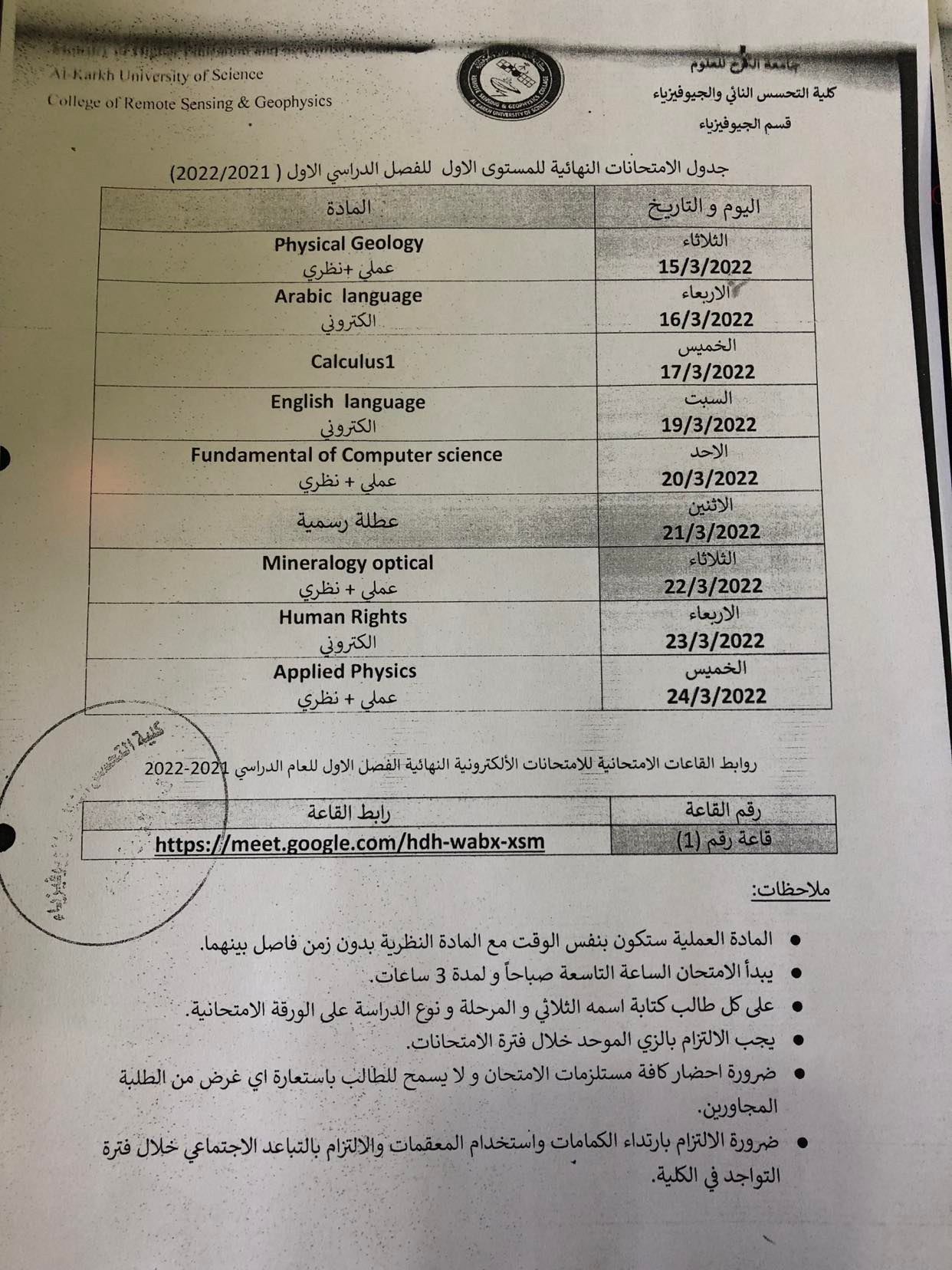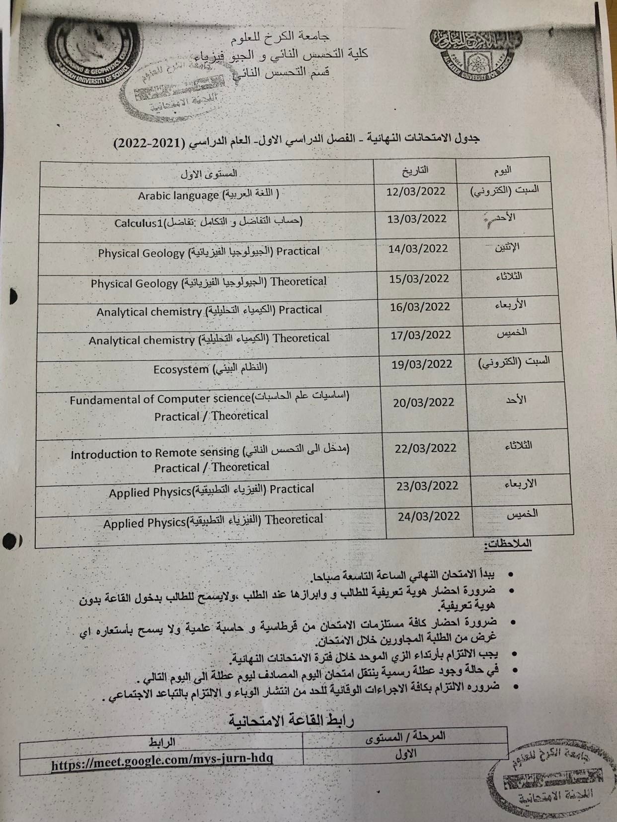 جدول الامتحانات النهائية المستوى الاول Categories لوحة الاعلانات Date مارس 16, 2022 جدول الامتحانات النهائية المستوى الاول للعام الدراسي 2022-2023 الفصل الدراسي الاول قسم التحسس النائي قسم الجيوفيزياء Share: admin6342 Previous post جامعة الكرخ للعلوم تقييم احتفالية بمناسبة يوم المرأة العالمي مارس 16, 2022 Next post تنويه هام لطلبتنا الاعزاء أبريل 4, 2022 You may also like إعلان هام | إطلاق جدول مراقبات امتحانات الدراسات العليا 18 ديسمبر, 2025 كلية التحسس النائي والجيوفيزياء تعلن نتائج القبول الأولي للمتقدمين إلى الدراسات العليا للعام الدراسي 2025–2026 10 يوليو, 2025 إعلان أسماء المشمولين بأداء الامتحان التنافسي للعام الدراسي 2025–2026 22 يونيو, 2025