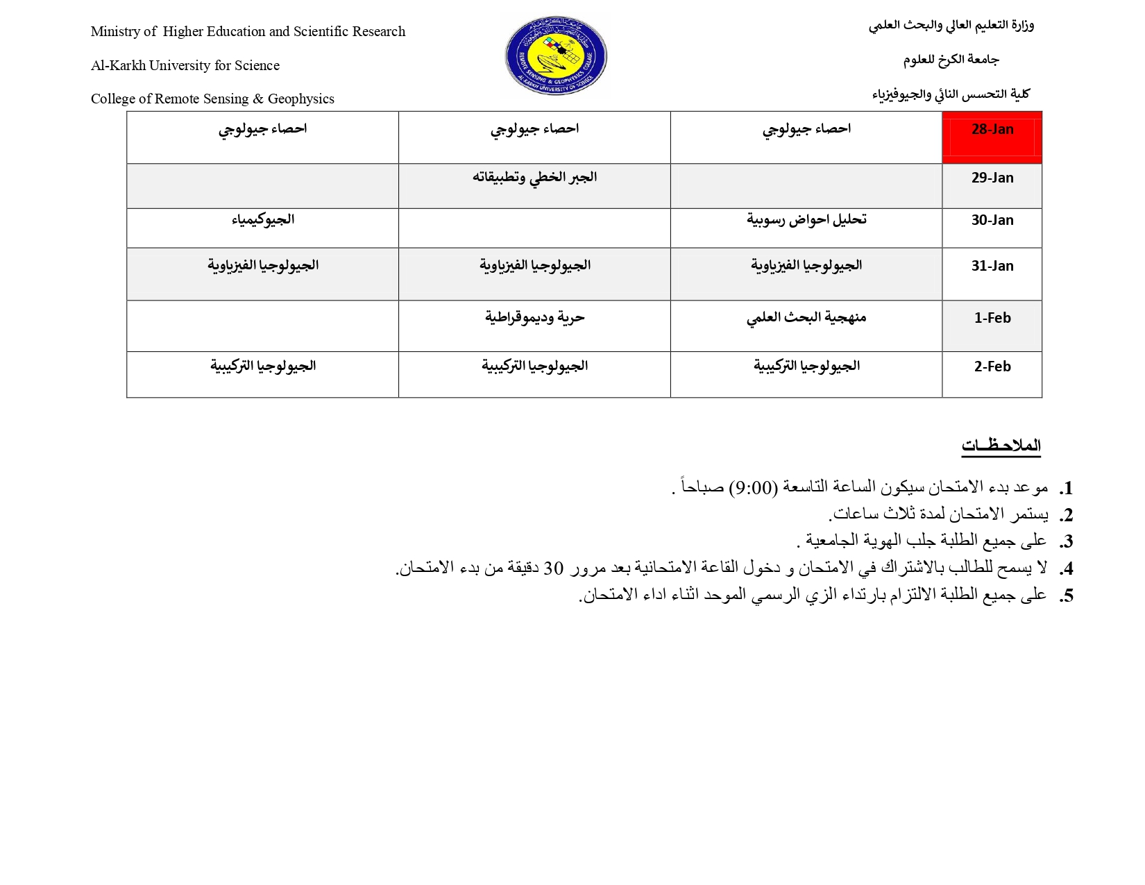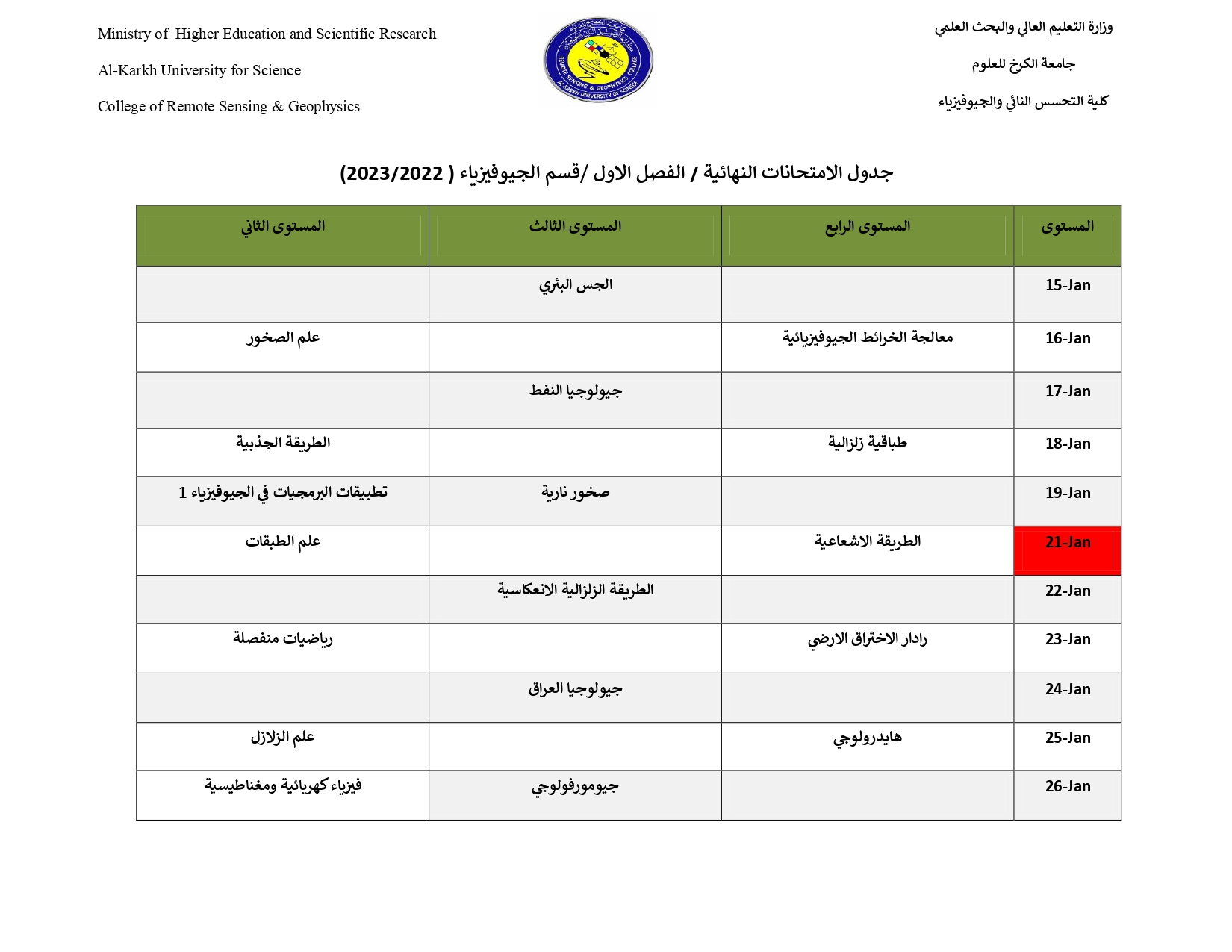جدول الامتحانات النهائية / قسم الجيوفيزياء Categories اخبار الكلية Date يناير 10, 2023 Comments 3 comments Share: admin6342 Previous post لجنة من وزارة التعليم العالي تطلع على سير الامتحانات الجارية في كلية التحسس النائي والجيوفيزياء يناير 10, 2023 Next post جدول الامتحانات النهائية / قسم التحسس النائي يناير 11, 2023 You may also like عميد كلية التحسس النائي والجيوفيزياء يتفقد سير امتحانات نهاية الكورس الأول 4 يناير, 2026 كلية التحسس النائي والجيوفيزياء تنظم ورشة عمل بعنوان “هجرة الشباب هدر لقدرات المجتمع” 22 ديسمبر, 2025 جامعة الكرخ للعلوم تنظم المؤتمر التقويمي للاعتماد البرامجي لتعزيز جودة التعليم الأكاديمي 22 ديسمبر, 2025