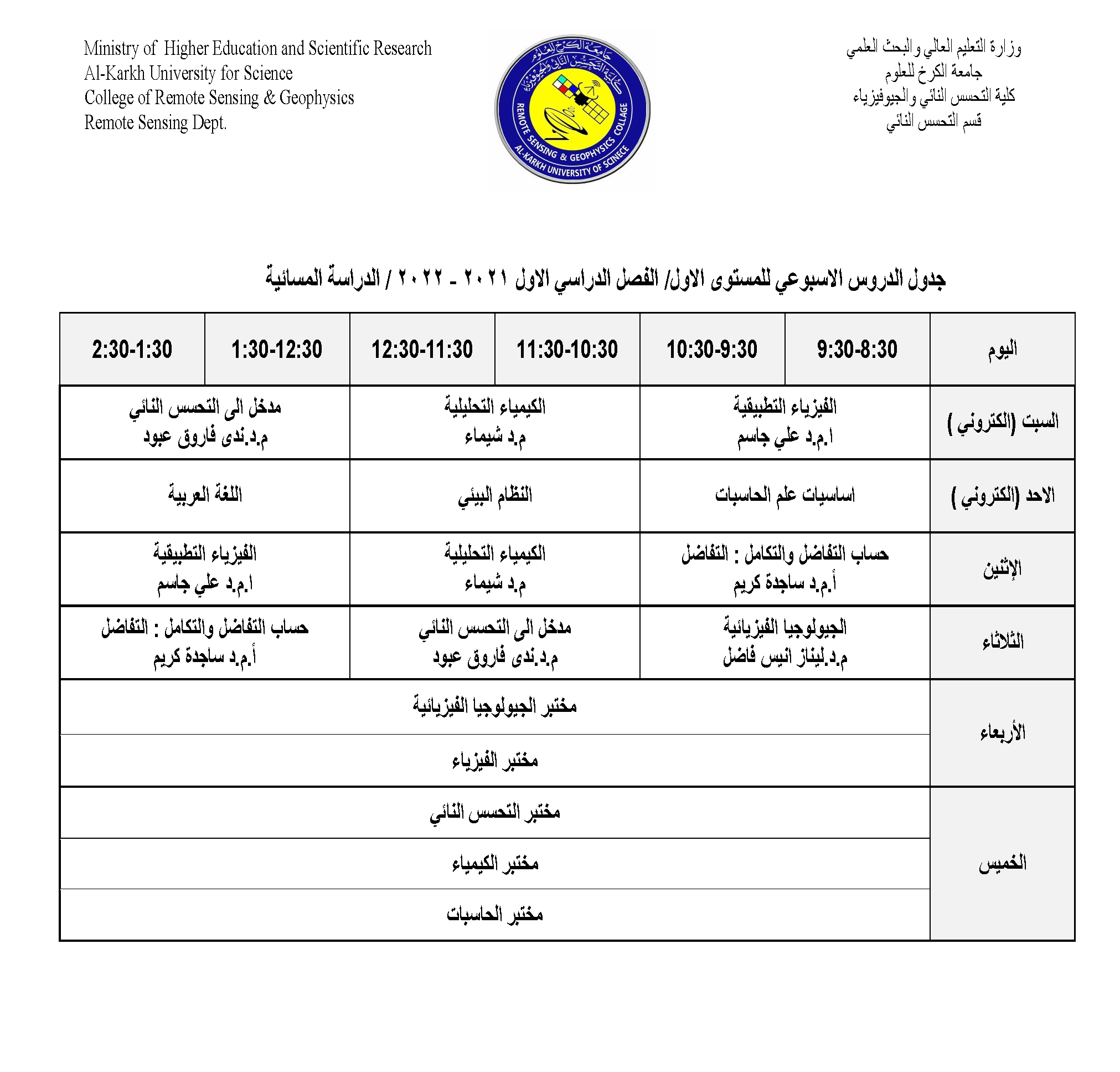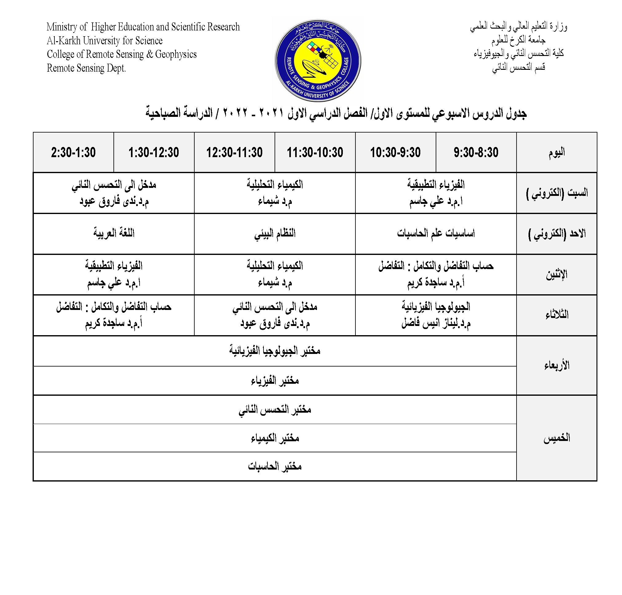 جدول الدروس الاسبوعي للمستوى الاول / قسم التحسس النائي