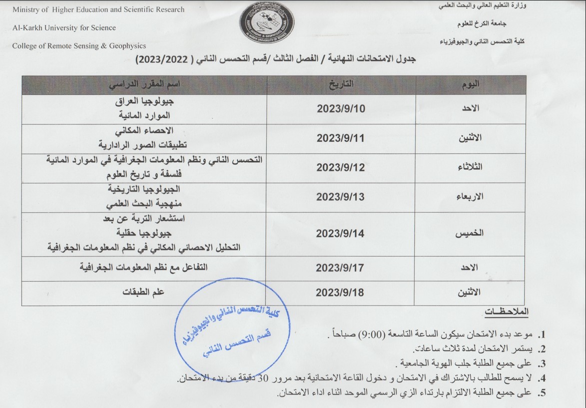 جـدول الامتحانـات النهــائية للـفصل الثـالث/قســم التحسـس النائــي (2023/2022) Categories لوحة الاعلانات Date أغسطس 31, 2023 Comments 4 comments هام جداً للطلبة جدول الامتحانات النهائية للفصل الثالث قسم التحسس النائي 2023 Share: admin6342 Previous post اعلان نتائج القبول النهائي للدراسات العليا للعام الدراسي 2023-2024 جامعة الكرخ للعلوم أغسطس 31, 2023 Next post جــدول الامتحـانـات النهـائية للفصـل الثـالث/ قســـم الجيـوفيزيـاء (2022/2023) سبتمبر 1, 2023 You may also like إعلان هام | إطلاق جدول مراقبات امتحانات الدراسات العليا 18 ديسمبر, 2025 كلية التحسس النائي والجيوفيزياء تعلن نتائج القبول الأولي للمتقدمين إلى الدراسات العليا للعام الدراسي 2025–2026 10 يوليو, 2025 إعلان أسماء المشمولين بأداء الامتحان التنافسي للعام الدراسي 2025–2026 22 يونيو, 2025