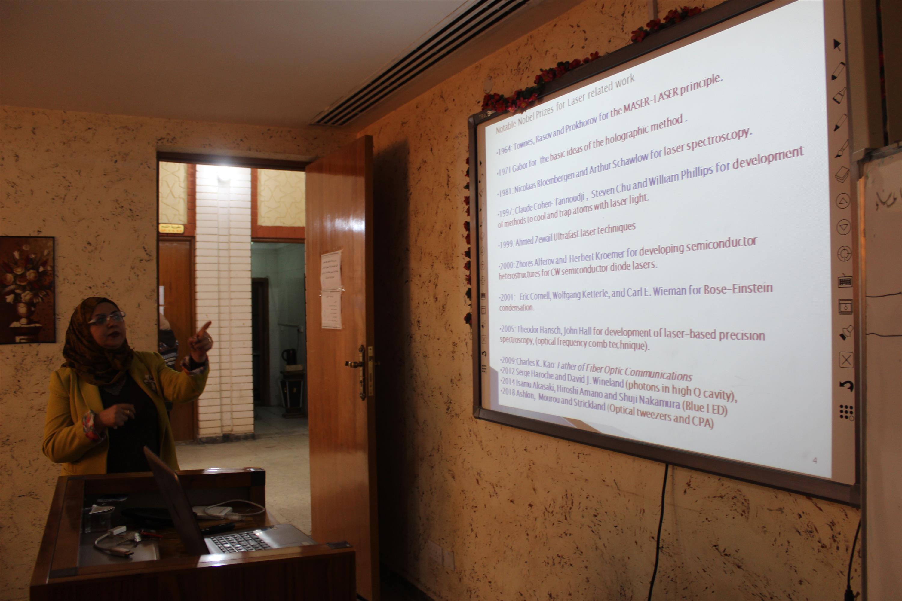 عرضت التدرسية اهم جوائز نوبل في علم الليزر والطرق التي ابتكرتها البشرية من خلال ايجاد مواد مختلفة تمكننا من اجراء االانتقالات للاكترونات وبطاقات مختلفة .