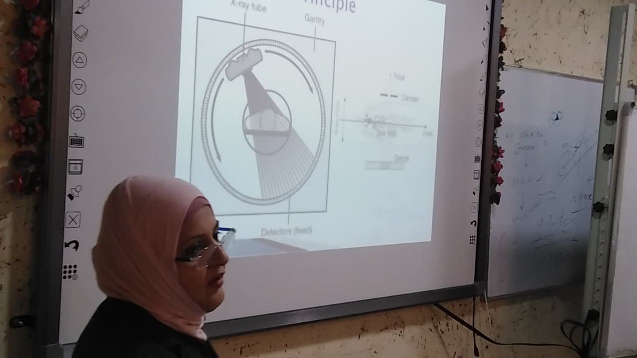 استعرضت المحاضرة نبذة تأريخيه لتصميم الجهاز والاجهزة التي سبقته ( 2D imaging X-Ray وطريقة عمل كل جزء وهو جهاز فحص عبارة عن ماسح يعمل بحركة دائرية، مرتبط بجهاز حاسوب ذو أداء عال، يقوم بتحليل الصورة الشاملة .