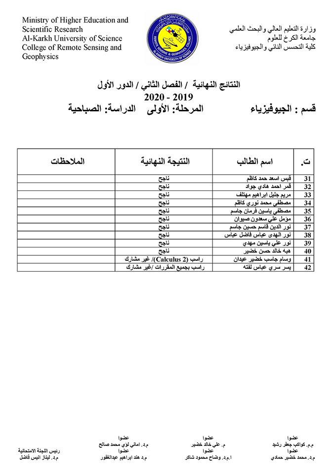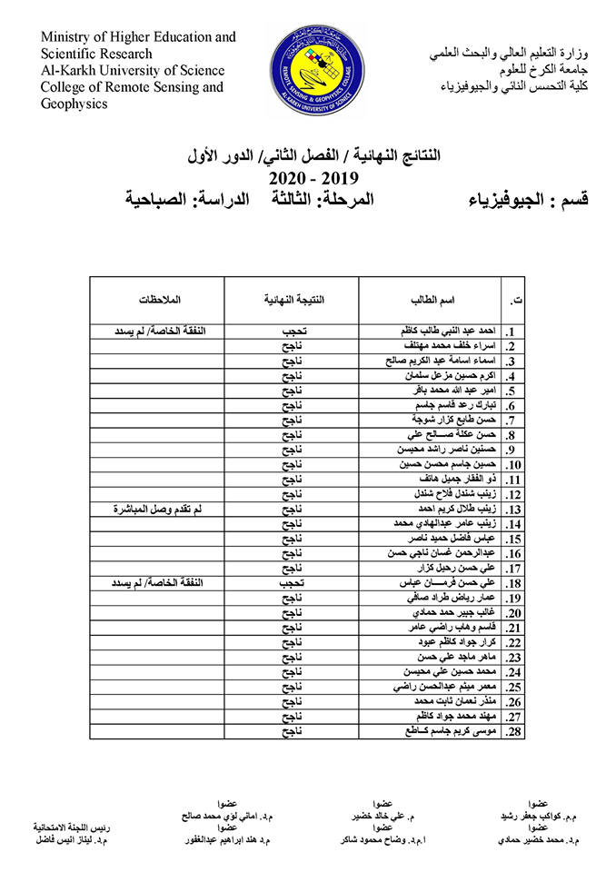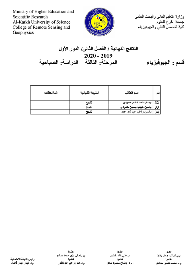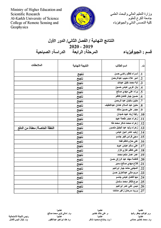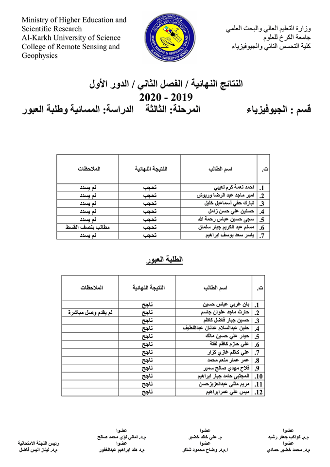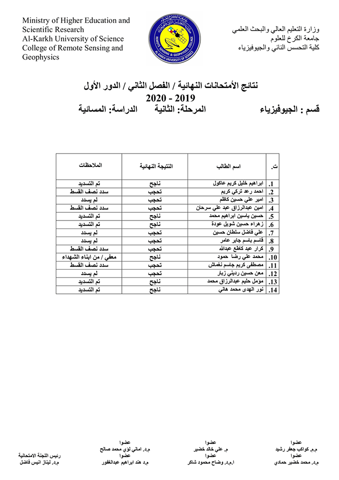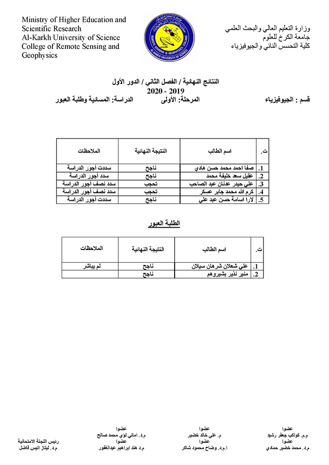 قسم الجيوفيزياء نتائج الامتحانات الالكترونية النهائية للفصل الدراسي الثاني