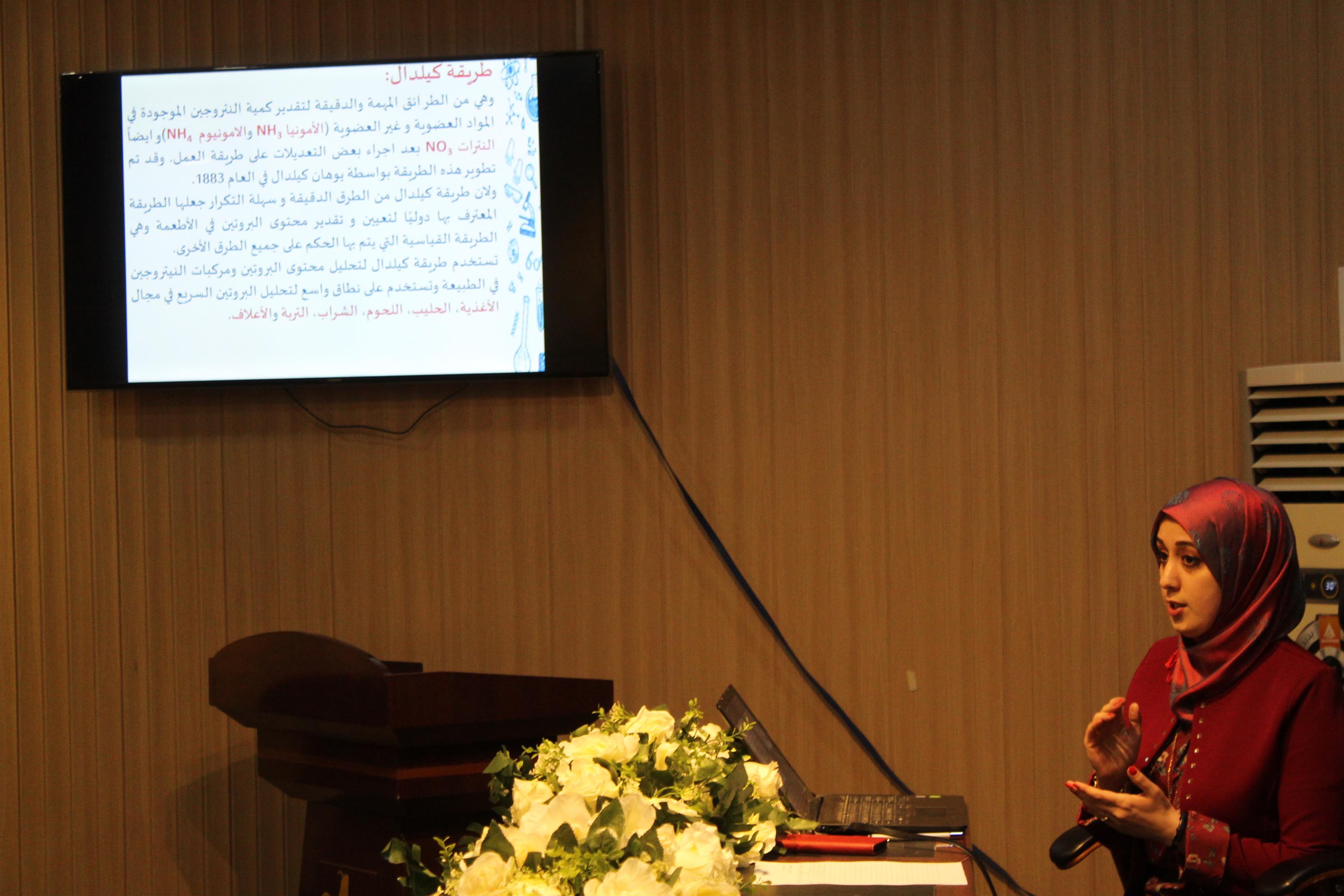 وهدفت المحاضرة الى التعريف بالتطبيقات الرئيسية لتحليل النيتروجين في الصناعات واهما في استخدام محلل النيتروجين أساسا لتحديد محتوى النيتروجين والبروتين الخام في العينة تستخدم أساسا في الأغذية والأعلاف، والزراعة، ومعاهد البحوث، والطب، والجامعات، والمواد الكيميائية يوميا، والأسمدة التربة.