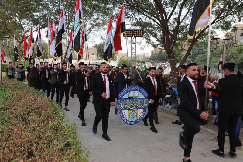 وكانت أولى فعاليات الاحتفال عزف النشيد الوطني ، بعدها قراءة آيات من الذكر الحكيم ثم قراءة سورة الفاتحة ترحما على أرواح شهداء العراق، واستعراض كراديس الطلبة الخريجين من كليات الجامعة.