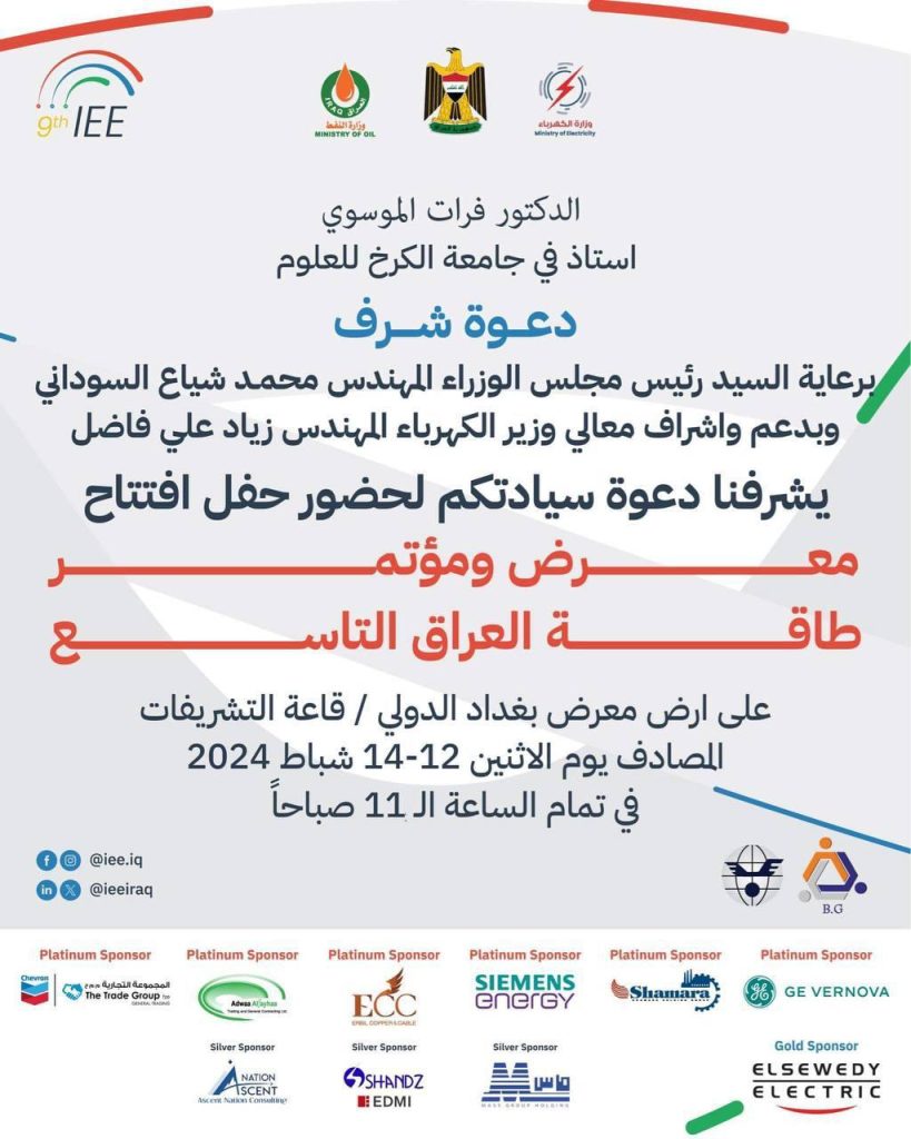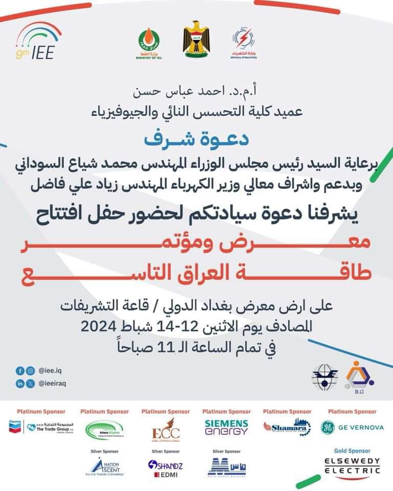 شارك كل من السيد عميد كلية التحسس النائي والجيوفيزياء الدكتور احمد عباس المحترم والتدريسي الدكتور فرات الموسوي المحترم و عدد من طلبة مشروع التخرج في معرض ومؤتمر طاقة العراق في دورته التاسعة الذي اقيم على ارض معرض بغداد الدولي برعاية السيد رئيس مجلس الوزراء المحترم وباشراف السيد وزير الكهرباء المحترم بتاريخ 12-14 /2/2024 .