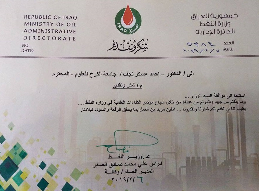 حصل معاون عميد كلية التحسس النائي والجيوفيزياء للشؤون العلمية الدكتور احمد عسكر نجف على كتاب شكر وتقدير من معالي وزير النفط لجهوده المبذولة لانجاح مؤتمر الكفاءات العلمية في وزراة النفط .