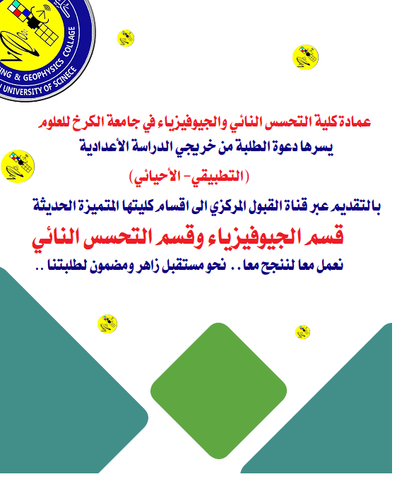 مع اقتراب أطلاق الاستمارة الالكترونية الخاصة بالقبول المركزي لطلبة السادس الاعدادي ، يسر عمادة كلية التحسس النائي والجيوفيزياء .