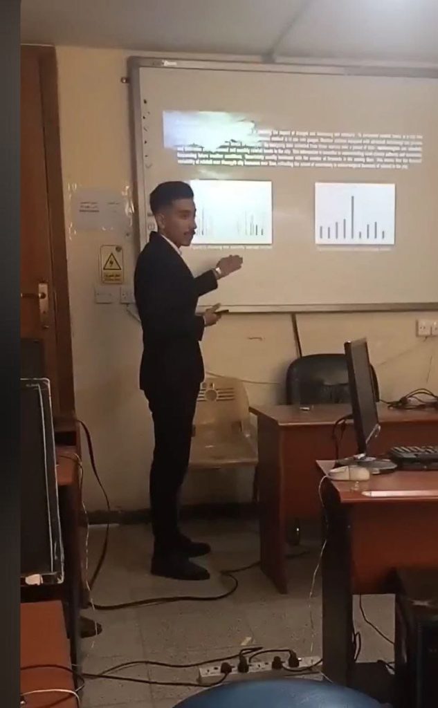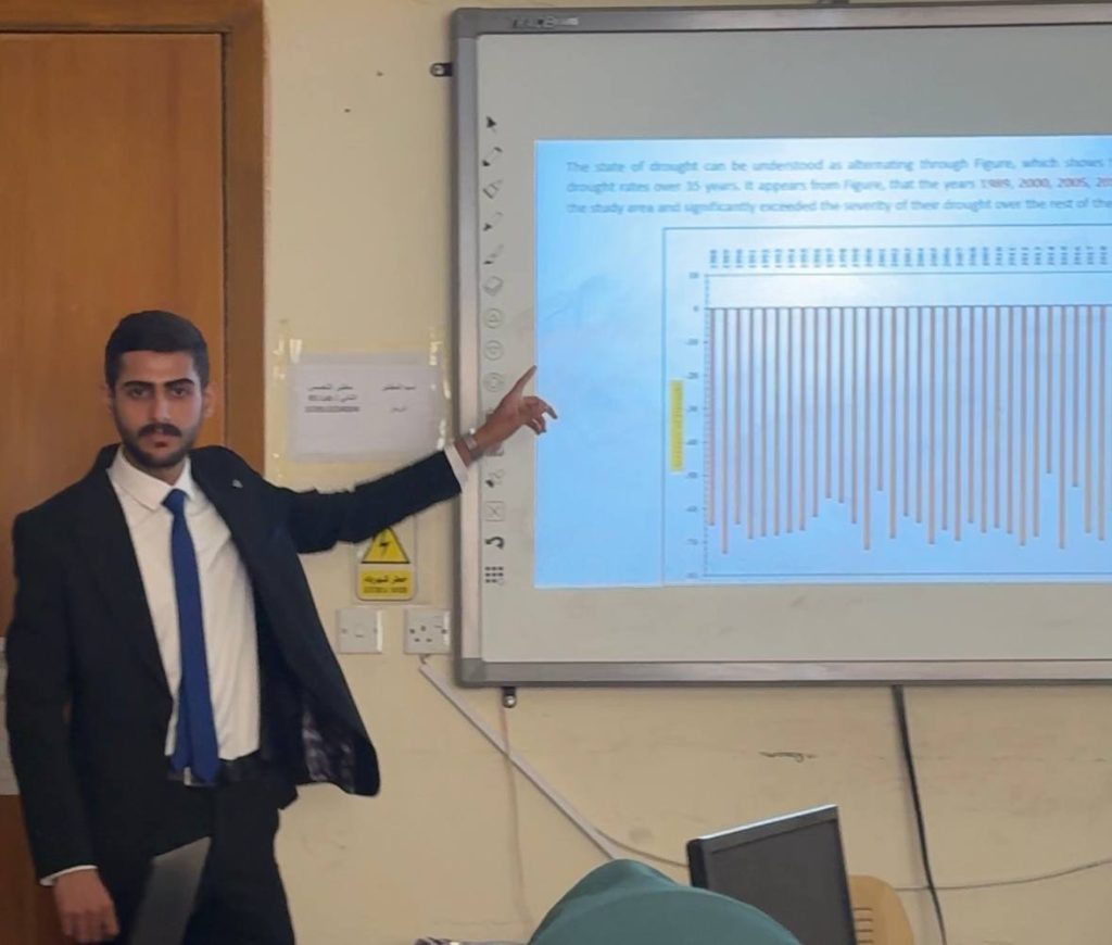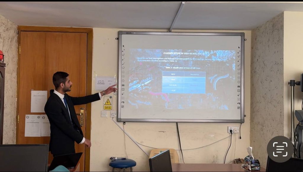 وأخيرًا، في يوم الخميس الموافق 16/5/2024، تم مناقشة مشروع تخرج الطلبة (إبراهيم أحمد إبراهيم، محمد قيس ياسين، أميمة خالد أحمد، تبارك نجم عبد الإله، وحسنين عبدالعظيم) بعنوان “Assessing Drought Conditions in Southern Baghdad (1988-2023) Using NDVI Anomaly and Its Impact on Soil and Vegetation” بإشراف أ.د. أوراس محي طه. هدف المشروع إلى تقييم مستويات الجفاف ودراسة تدهور الغطاء النباتي وتقييم سطح التربة في منطقة جنوب بغداد من عام 1988 إلى 2023.