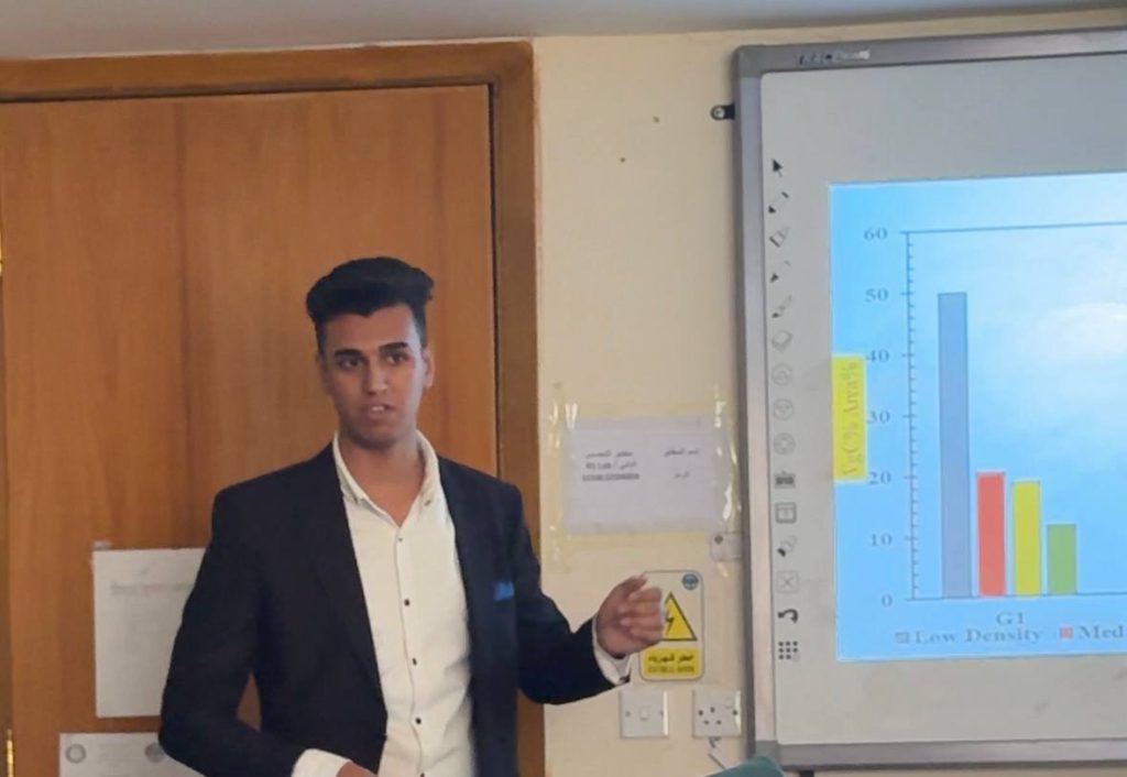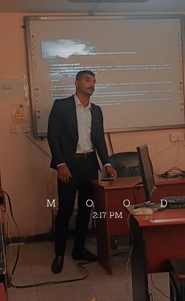 وفي نفس اليوم، تمت مناقشة مشروع تخرج للطلبة (بنين محمد عامر، عمر محمد عبدالواحد، رجب عماد حمود، ومريم فراس ناجي) بعنوان “Climate changes that affect the soil” بإشراف م.د. ندى فاروق عبود. تضمن المشروع دراسة العلاقة بين التغيرات المناخية وتأثيرها على خصائص التربة في منطقة المسيب بمحافظة بابل. وأظهرت النتائج تأثير ارتفاع درجة الحرارة وانخفاض رطوبة التربة على خصوبة التربة وقدرتها على الاحتفاظ بالمياه، مما يدعو لتبني ممارسات زراعية مستدامة للتخفيف من آثار التغير المناخي.