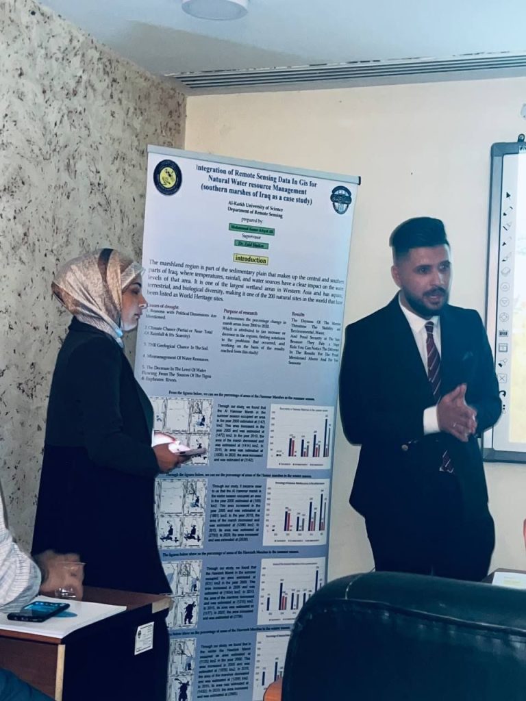 وفي يوم الأربعاء الموافق 22/5/2024، ناقش الطلبة (محمد سامر عزيز وآيات علي حسين) مشروعهم الذي جاء بعنوان “Integration of Remote Sensing Data in GIS for Natural Water resource Management (southern marshes of Iraq as a case study)” بإشراف م.د. زيد شاكر كاظم. ركز المشروع على تقييم ظاهرة الجفاف في أهوار العراق من خلال تحليل التغيرات الطارئة عليها باستخدام تقنيات الاستشعار عن بعد ونظم المعلومات الجغرافية، مما أسفر عن إنتاج خرائط مصنفة توضح نسب التباين للفترة الممتدة من 2000 إلى 2020.
