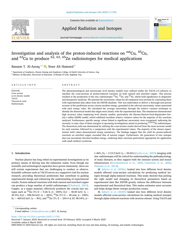 وذلك في المجلة الأمريكية Applied Radiation and Isotopes، المصنفة ضمن مستوعبي سكوباس وكلاريفيت (Q2)، مما يعكس أهمية البحث ودوره في تطوير التطبيقات الطبية الإشعاعية.