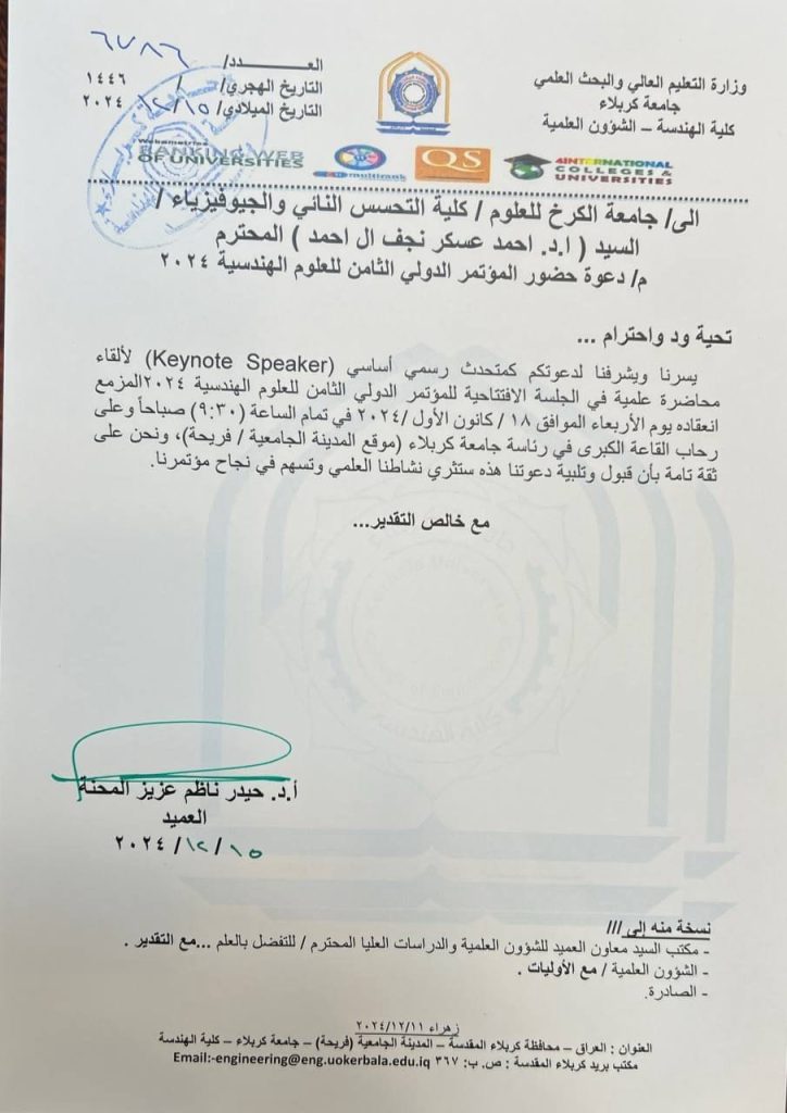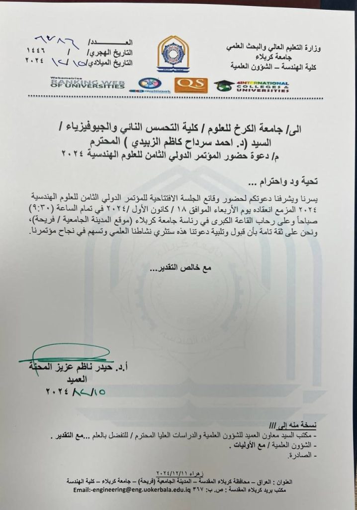 كلية التحسس النائي والجيوفيزياء تشارك في المؤتمر الدولي الثامن للعلوم الهندسية 2024 في جامعة كربلاء