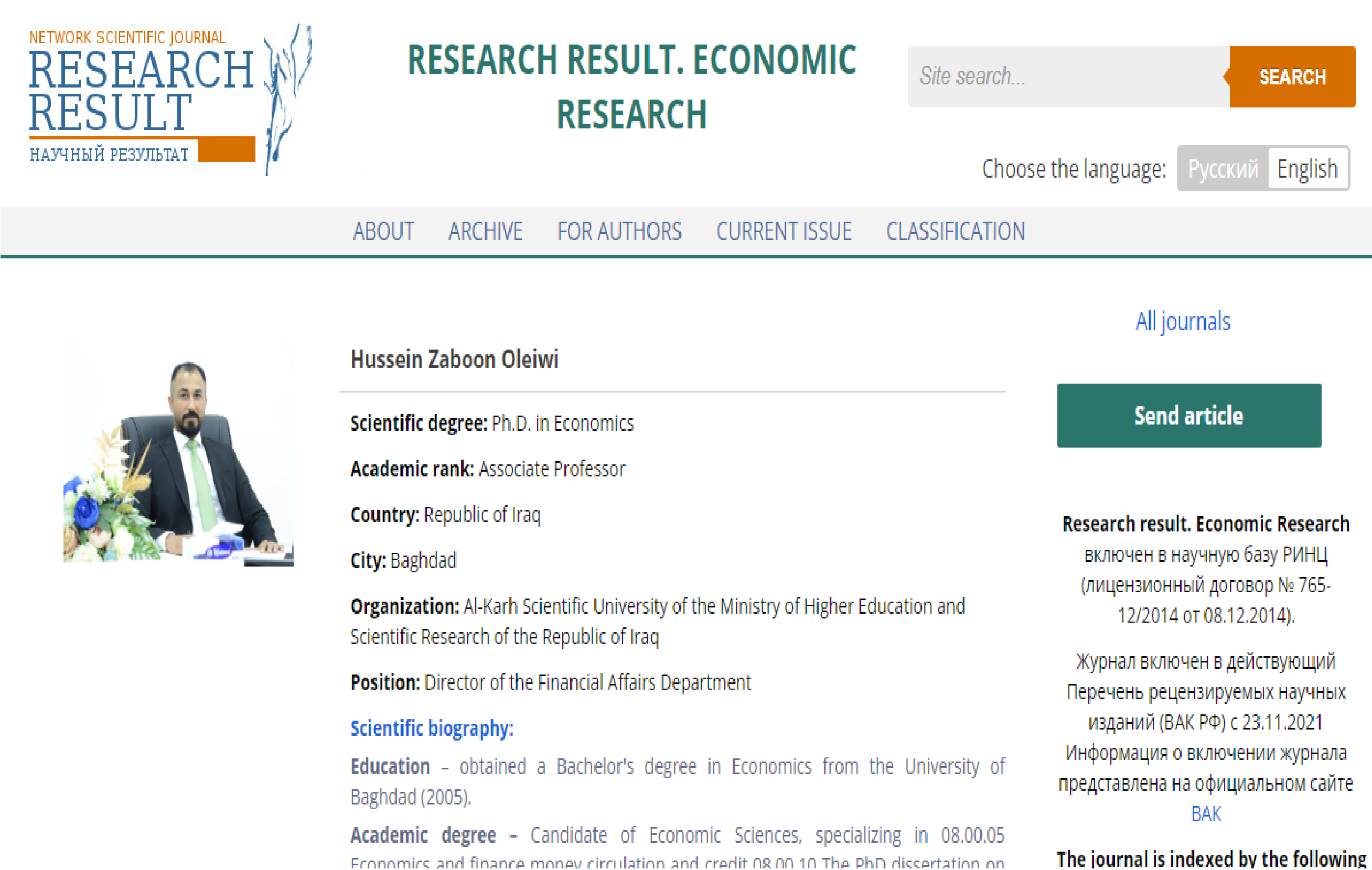 حصــل التدريســي فـي كليـة التحسـس النائـي والجيوفيزيـاء (م.د. حسيــن زبون عليــوي) علـى عضويـة هيئة تحرير فـي المجلة العالمية Research Result. Economic Research وهي مجلة تعنى بنشر …