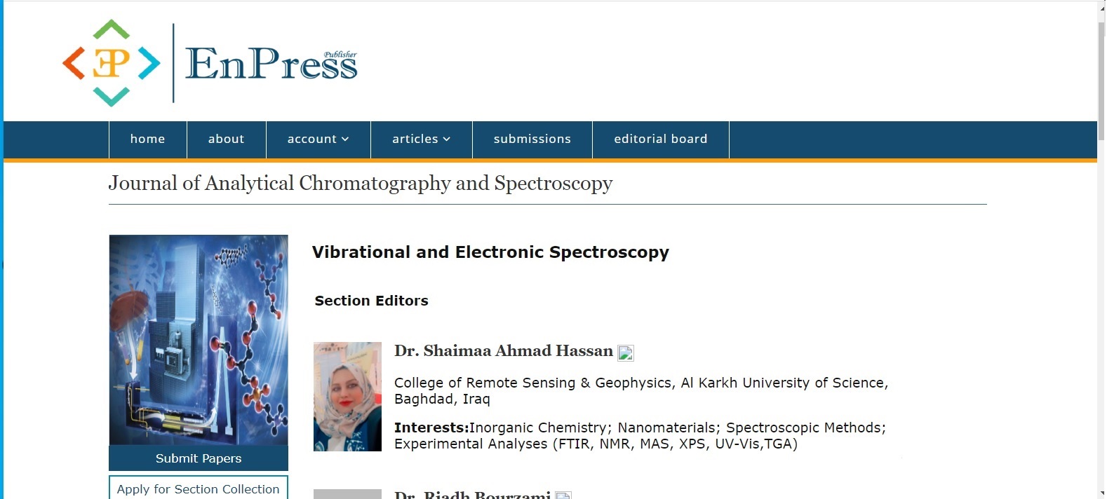 تـم اختيـــــار (أ.م.د. شيمــــاء احمــد حســــن) التدريسيـة فـــي كليــة التحـــسس النائـــي والجيوفيزيــاء كمــحررة فـــي قســــم Vibrational and Electronic Spectroscop التابع للمجلة العالمية Journal of Analytical Chromatography and Spectroscopy وهي مجلة دولية مفتوحة المصدر تنشر …