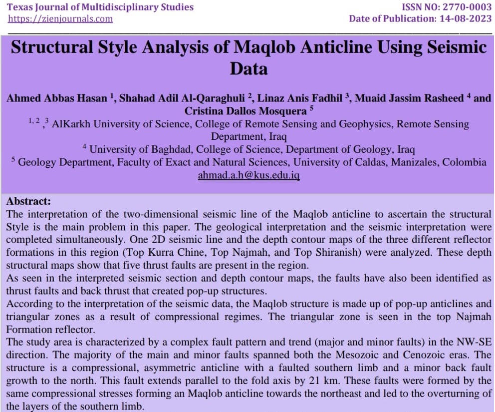 نشــر عـمـيد كـلية التحسس النائي والجيوفيزياء (ا. م. د. احـمـد عبـاس حسـن) بمشاركة (م.د ليـناز انيـس فاضل) و (م. شـهـد عـادل فاضل) بحـثاً عـلمياً …