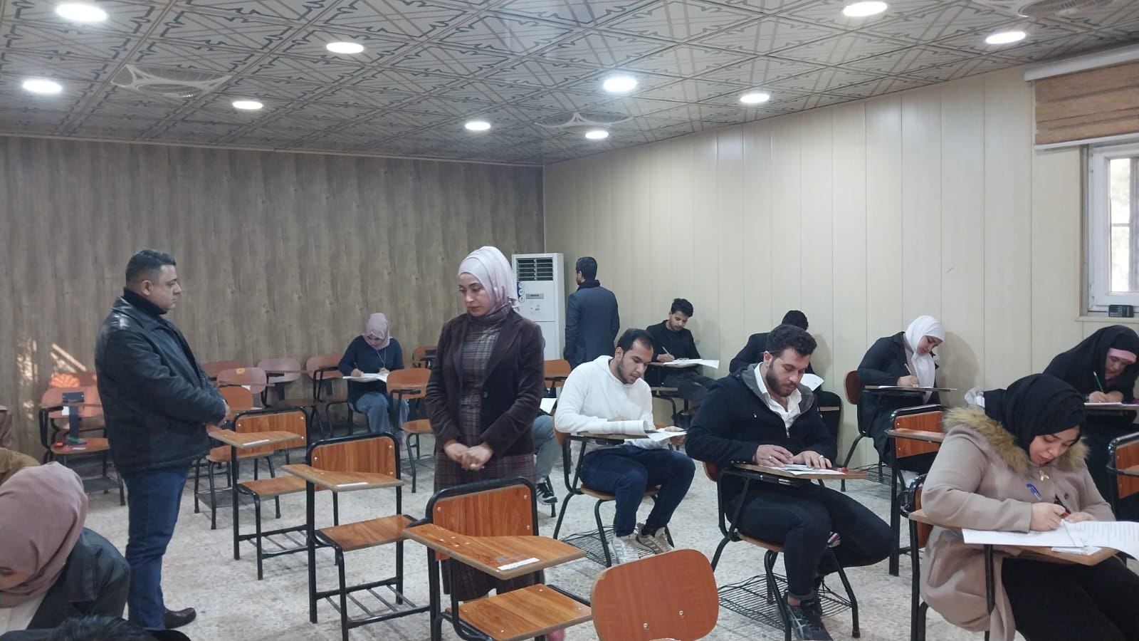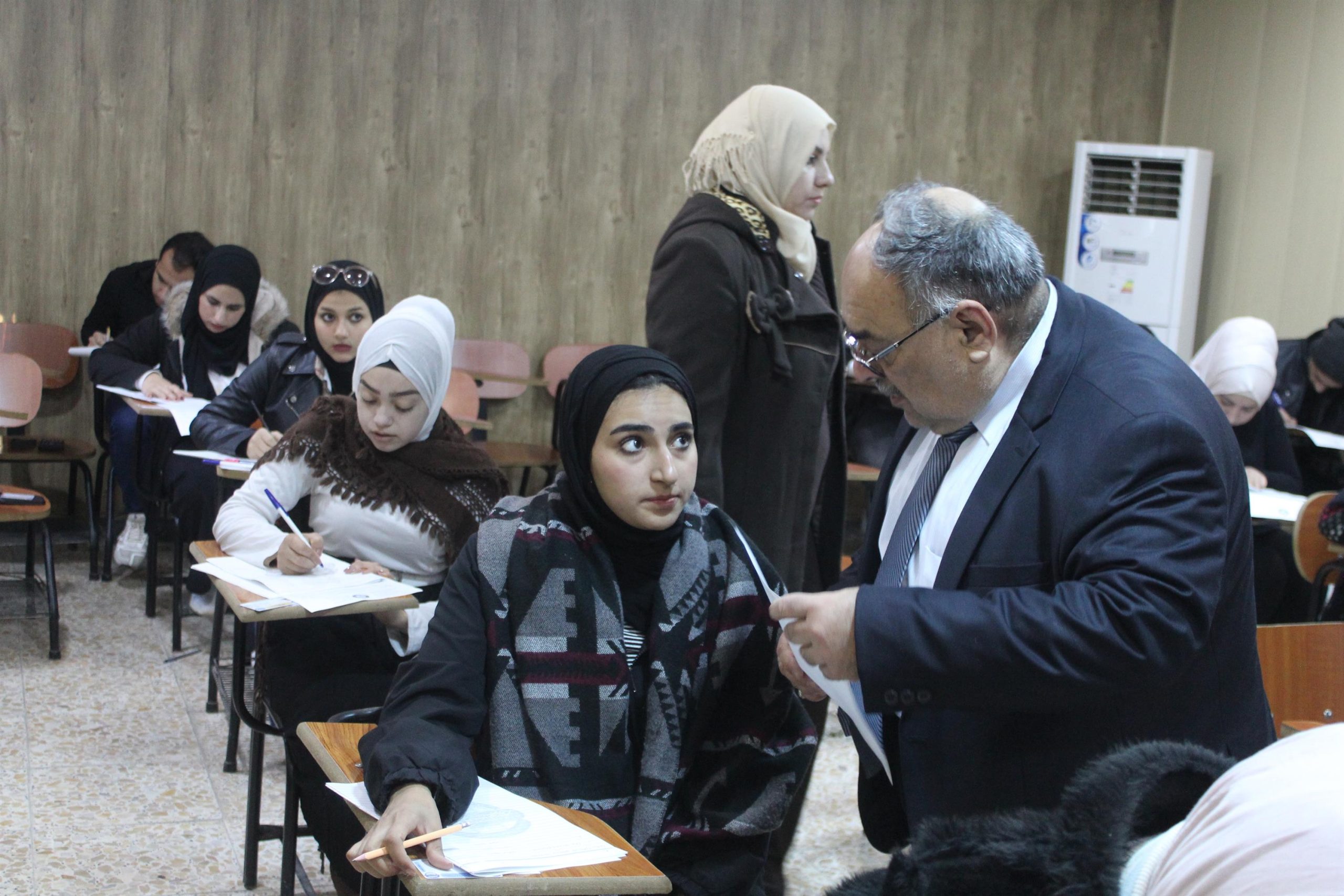 حيث تفقد السيد مساعد رئيس الجامعة للشؤون العلمية الدكتور لؤي كلظم عبود القاعات الامتحانية للاطمئنان على انسيابية اجراء الامتحانات مستمعاً الى اراء الطلبة عن الاسئلة وطبيعتها.