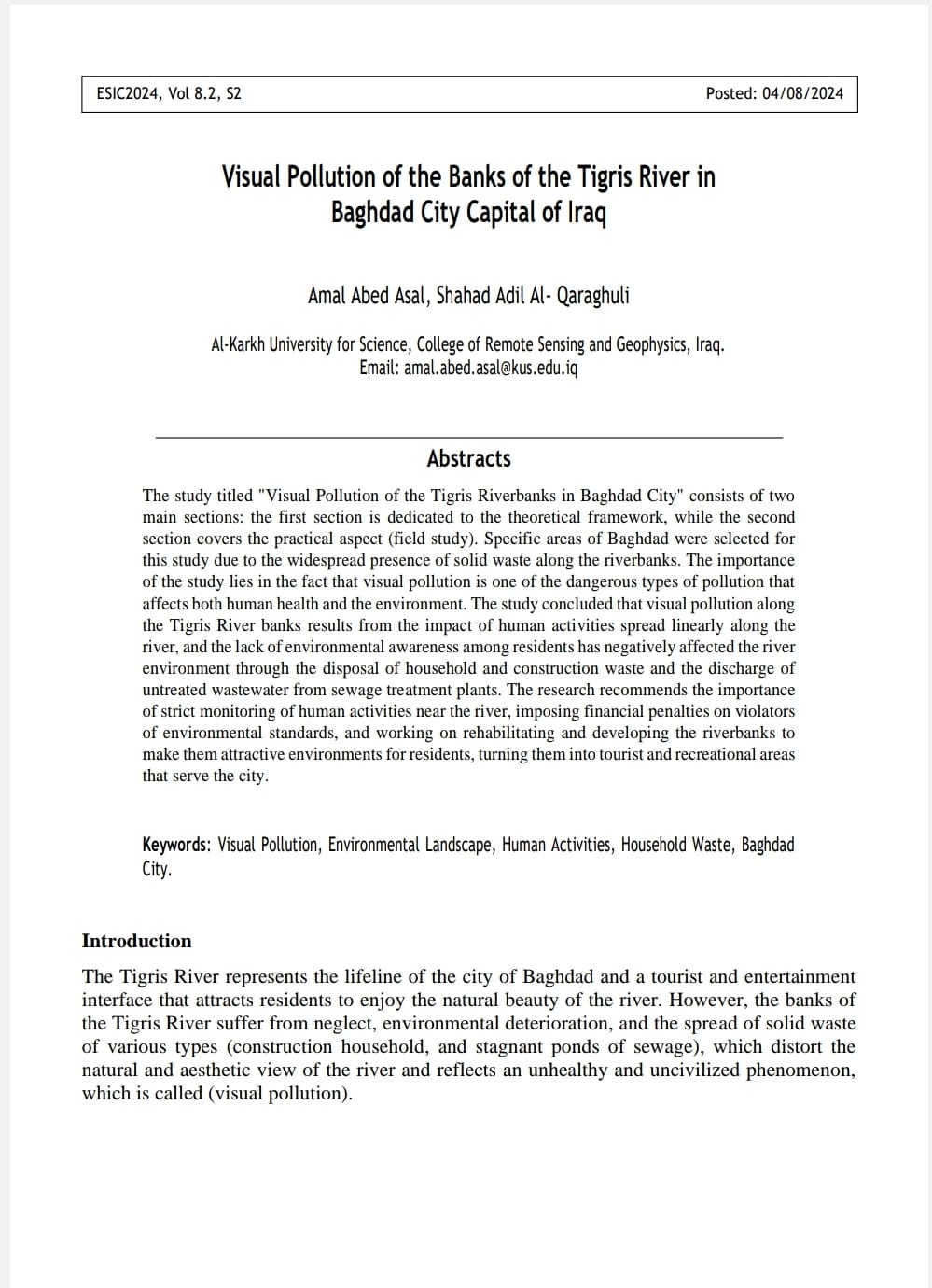 نشرت التدريسيتان م.م. آمال عبد عسل و م. شهد عادل فاضل، من كلية التحسس النائي والجيوفيزياء بجامعة الكرخ للعلوم، بحثًا علميًا متميزًا بعنوان “التلوث البصري لضفاف نهر دجلة في مدينة بغداد” في مجلة Evolutionary Studies in Imaginative Culture، التي تُصنّف …