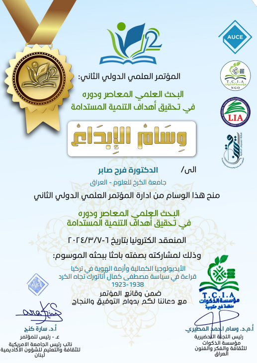 شاركت ا.م.د.فرح صابر محمد التدريسية في كليتنا في المؤتمر العلمي الدولي الثاني تحت عنوان(البحث العلمي ودوره المعاصر في تحقيق التنمية المستدامة) الذي عقدته الجامعة اللبنانية في بيروت بتاريخ 6-7/ 2024 :عن بحثها الموسوم “الأيديولوجيا الكمالية وأزمة الهوية في تركيا.قراءة في …
