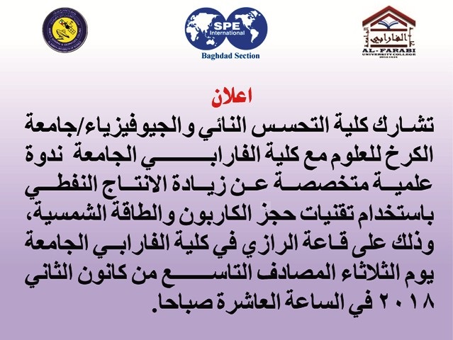 تشارك كلية التحسس النائي والجيوفيزياء / جامعة الكرخ للعلوم مع كلية الفارابي الجامعة ندوة علمية متخصصة عن زيادة الانتاج النفطي باستخدام تقنيات حجز الكاربون والطاقة الشمسية وذلك على قاعة الرازي في كلية الفارابي الجامعة يوم الثلاثاء المصادف التاسع من كانون الثاني 2018 الساعة العاشرة صباحا
