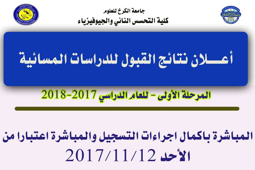 إعلان إلى الطلبة المتقدمين على الدراسة المسائية في كلية التحسس النائي والجيوفيزياء والذين معدلاتهم ٦٠ فما فوق مراجعة شعبة التسجيل في الكلية لغرض التسجيل على الدراسة المسائية