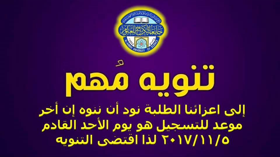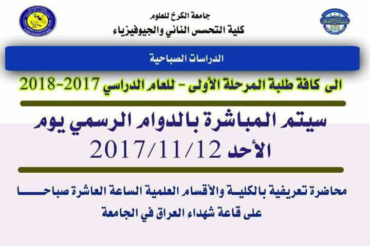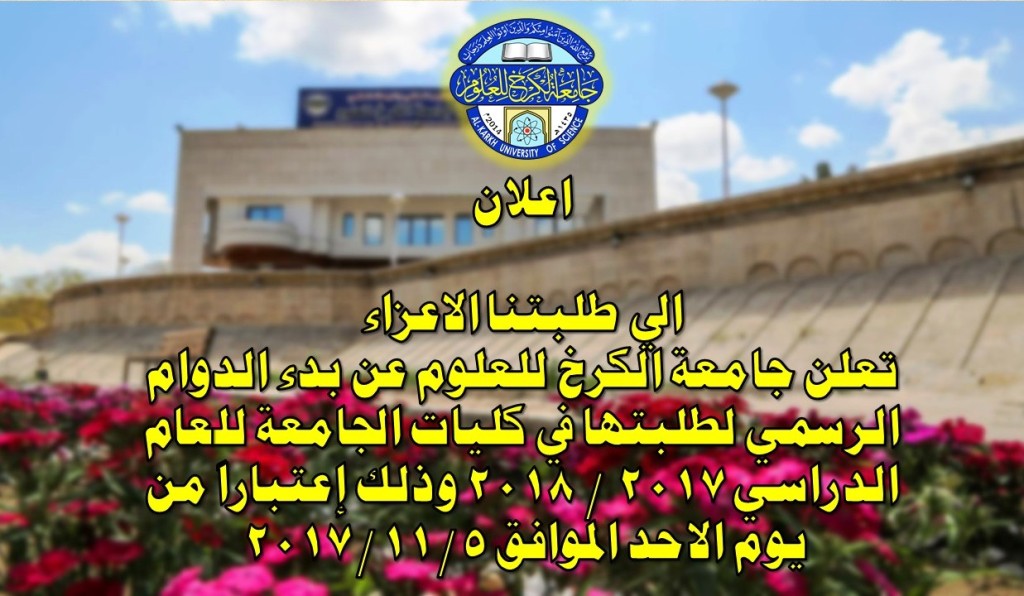 تعلن جامعة الكرخ للعلوم عن بدء الدوام الرسمي لطلبتها في كليات الجامعة للعام الدراسي 2017 / 2018 وذلك إعتباراً من يوم الاحد الموافق 2017/11/5