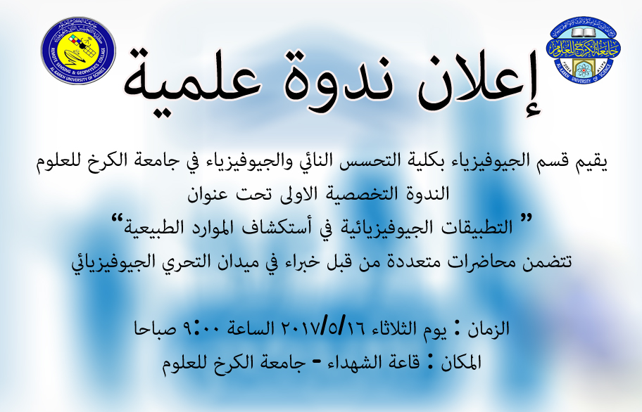 يقيم قسم الجيوفيزياء بكلية التحسس النائي والجيوفيزياء في جامعة الكرخ للعلوم الندوة التخصصية الاولى تحت عنوان ” التطبيقات الجيوفيزيائية في استكشاف الموارد الطبيعية” تتضمن محاضرات متعددة من قبل خبراء في ميدان التحري الجيوفيزيائي